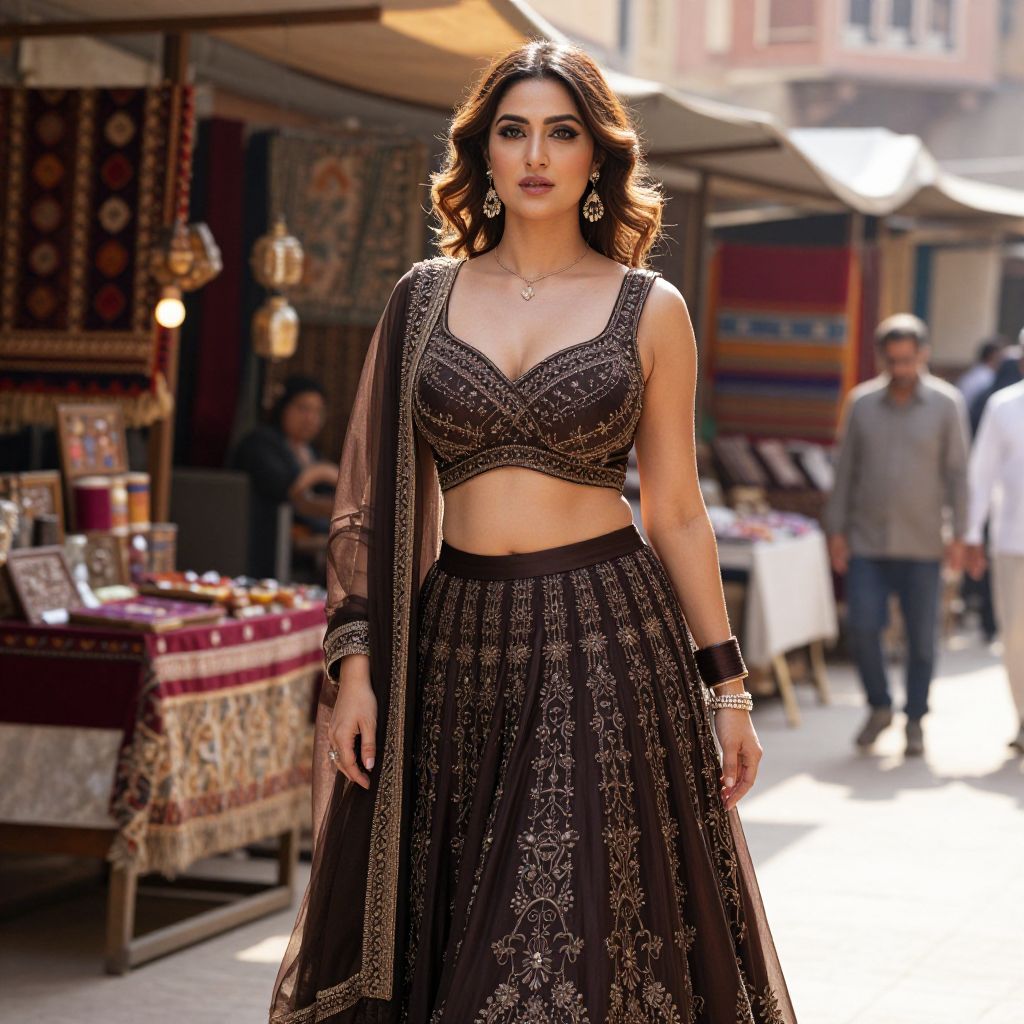 A mature woman with a delicate facial structure and warm brown eyes wearing a sumptuous chocolate colour lehenga as her costume, walking through a heritage market in Jaipur, with vintage stalls, sandalwood-scented air, and vibrant textiles in the background, the lehenga catching the sunlight beautifully.. The woman has big breasts and cute face