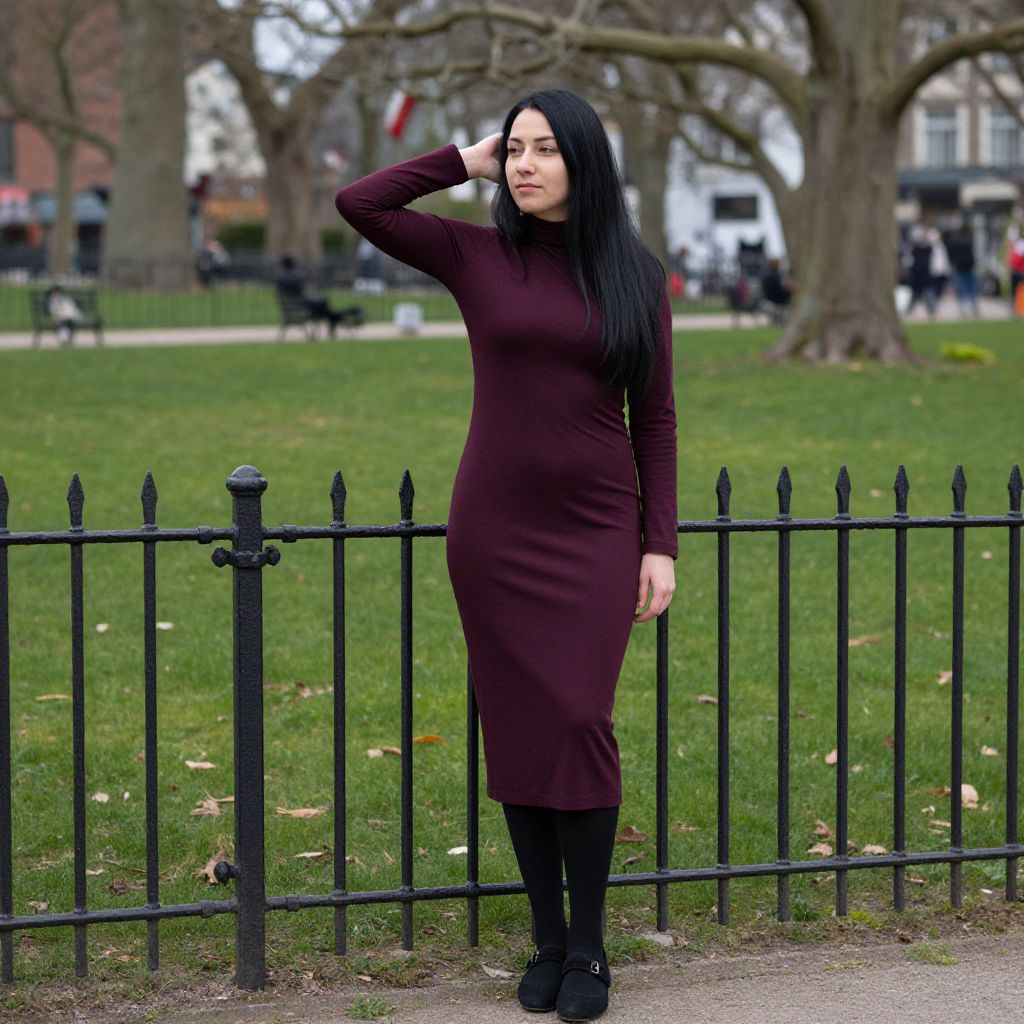 Photograph of a woman standing in a park. She has long black hair and is wearing a tight, long-sleeve, dark maroon dress that reaches mid-calf, paired with black tights and black shoes. She's leaning against a black iron fence with one hand on her head and gazing to the side. The background shows green grass, trees, and a few blurred buildings. The scene has a slightly overcast, calm atmosphere.
