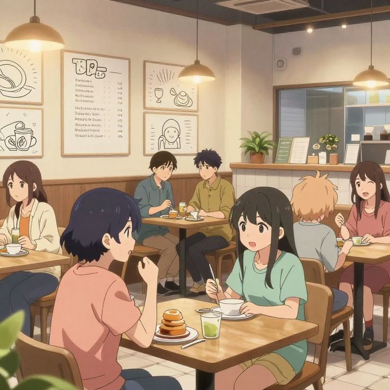 Anime style AI image generator illustrating a cozy modern cafe setting filled with anime-inspired characters engaging in lively conversations, warm lighting, delicate line art, and vibrant colors that evoke the charm of slice-of-life anime series merged with AI-enhanced visual depth.