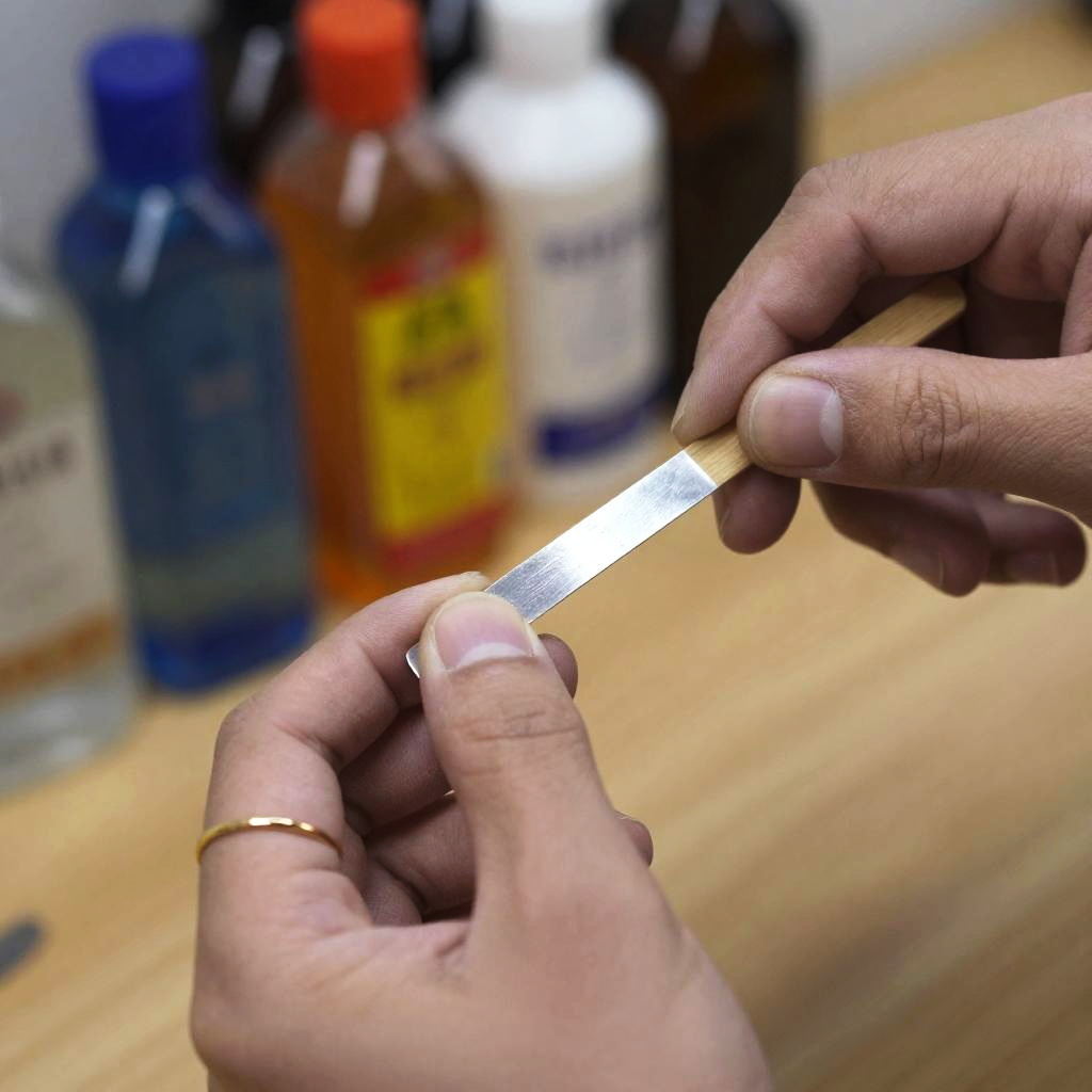 Close-up photo of two hands working together. One hand, with a gold ring on the middle finger, holds a silver strip of metal, while the other hand uses a wooden stick to shape it. The background is blurry with colorful bottles, suggesting a crafting or jewelry-making setup. The hands have light skin and the focus is sharp on the metal strip and hands.