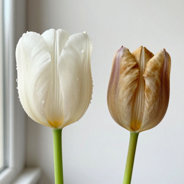 Photograph of two tulips against a bright white background. The left tulip is pure white with delicate water droplets on its petals, while the right tulip has brown and pinkish streaks on its petals. Both tulips have green stems. The white background is slightly blurred, with a hint of a window frame on the left. The image emphasizes the contrast between the two tulips and highlights their textures and colors. The lighting is natural, creating a soft, bright ambiance.
