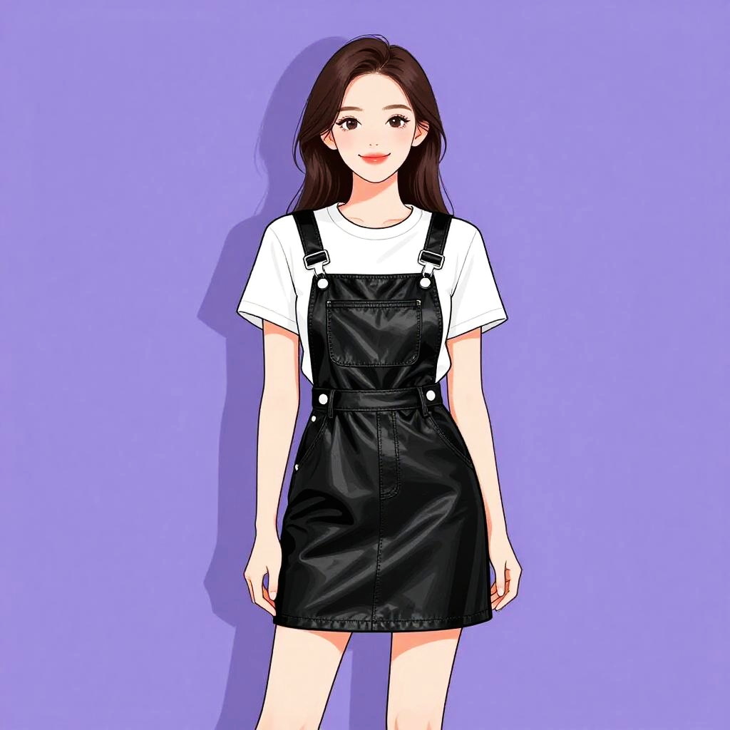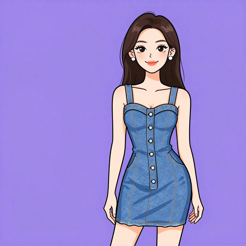 Illustration of a young woman with long brown hair and a pretty face, smiling. She is wearing a casual chic sleeveless denim mini dress with a pointed collar, front button fastening, two chest pockets with flaps, and a nipped waist with belt loops. The dress features subtle fading and the background is plain purple.