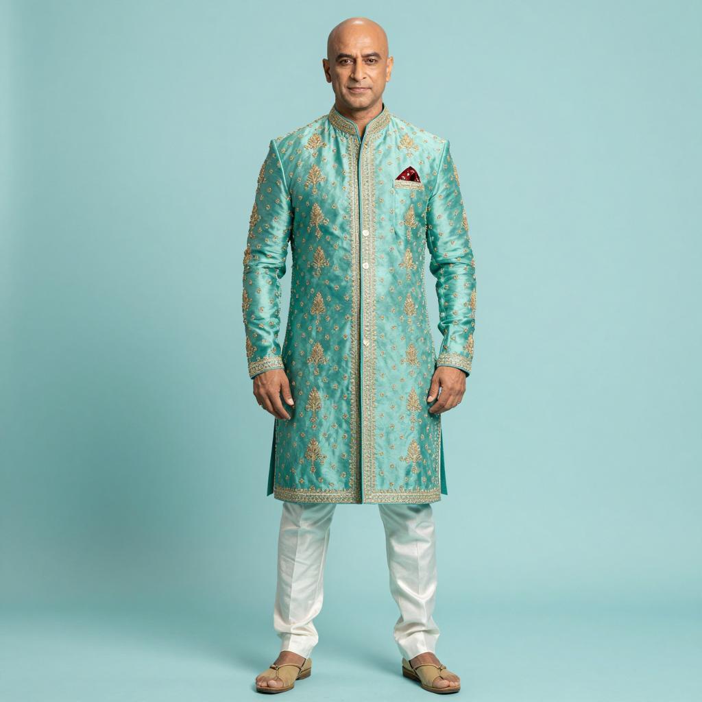 Photograph of a bald man in black traditional clothing standing barefoot, holding a cup in his right hand. Large, dark, jagged shadow extends from behind him, partially overlapping his figure. White background. Intense shadow contrasts with his calm expression.