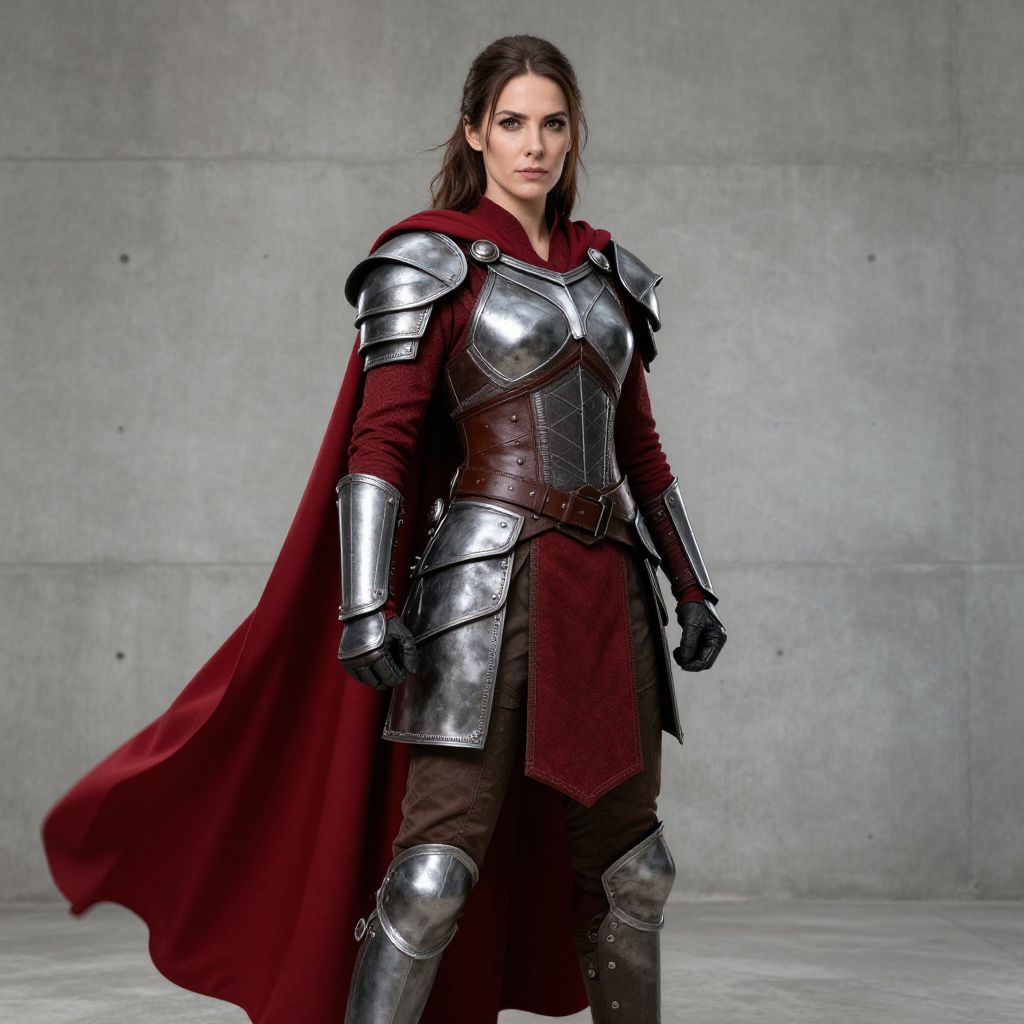 A determined woman dressed in detailed medieval-inspired armor with a red cape stands confidently against a plain concrete background. Her costume blends elements of fantasy and superhero styles, featuring metallic shoulder plates, gauntlets, and a sturdy leather belt.