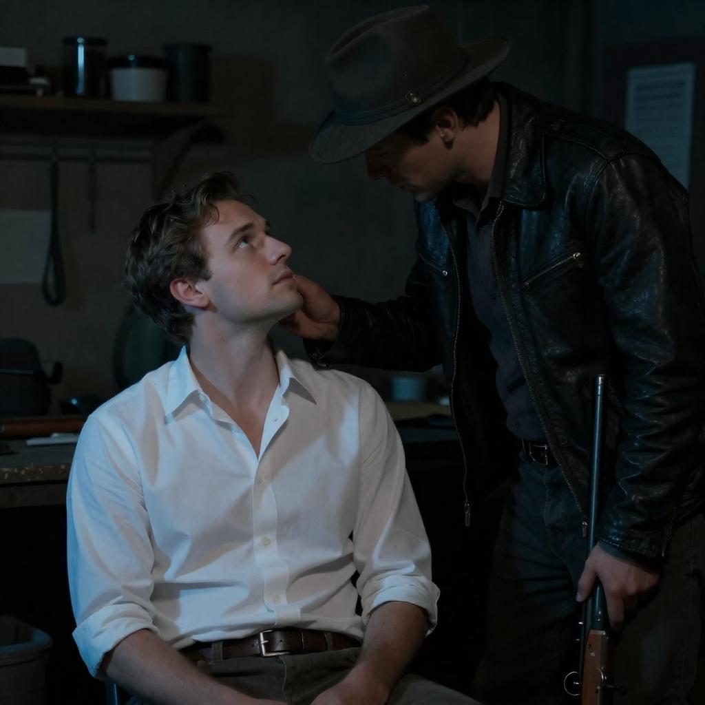 Photograph of two men on stage. The man on the left, wearing a brown hat, dark coat, and holding a silver revolver, faces the man on the right, who has shoulder-length brown hair, wears a sleeveless black leather vest, and extends his arm towards the other. Background includes dimly lit, industrial-style decor.
