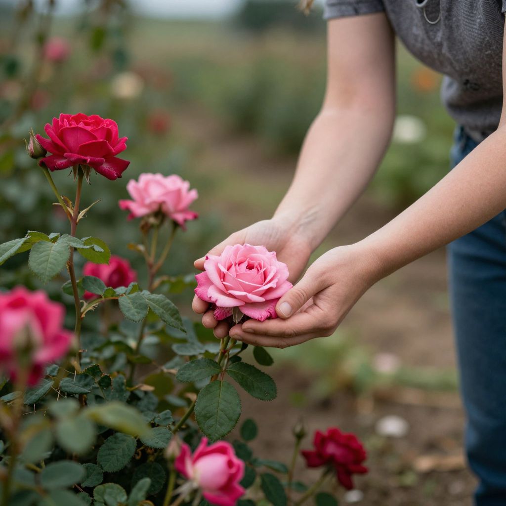 Woman Tending Vibrant Roses in Pastoral Setting