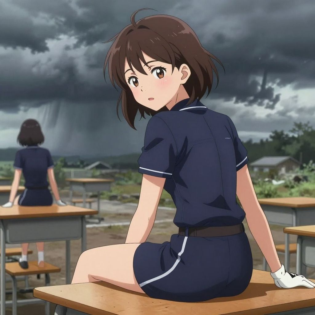 From Up, sitting on desk, desk, face to tiptoe, looking at another, contrapposto, dynamic pose, cinematic lighting, daytime, Wasteland after a Storm, 1girl, thick_eyebrows blush_stickers, brown_hair, brown_eyes, short_hair, sideburns, shiny hair, medium breasts, skindentation +++ v-shaped_eyebrows, :o, extremely quality extremely detailed, illustration, cute anime face, dark indigoGolf wear