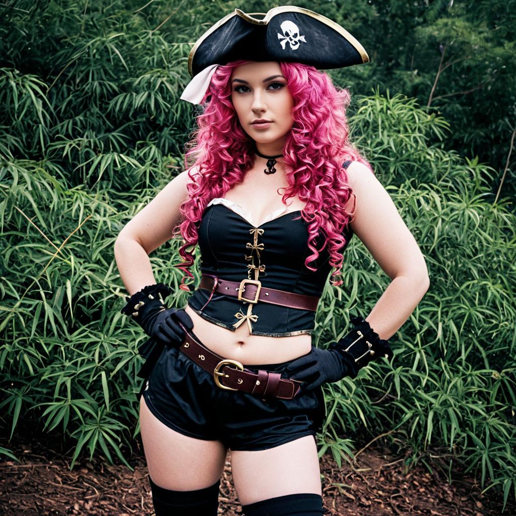 Pink pirate cosplay,1girl, solo, hat, pink hair, belt, long hair, shorts, pirate, thigh strap, thighhighs, pirate hat, curly hair, black shorts, gloves