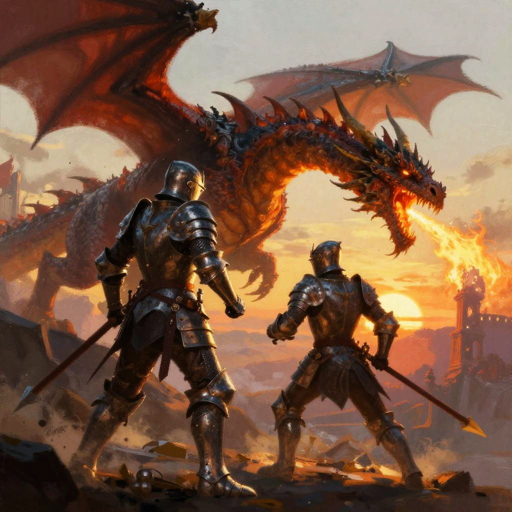 Knight vs dragon art, epic battle scene at sunset, highly detailed armor, fierce dragon with fiery breath, dynamic poses, fantasy landscape, dramatic lighting, digital painting style