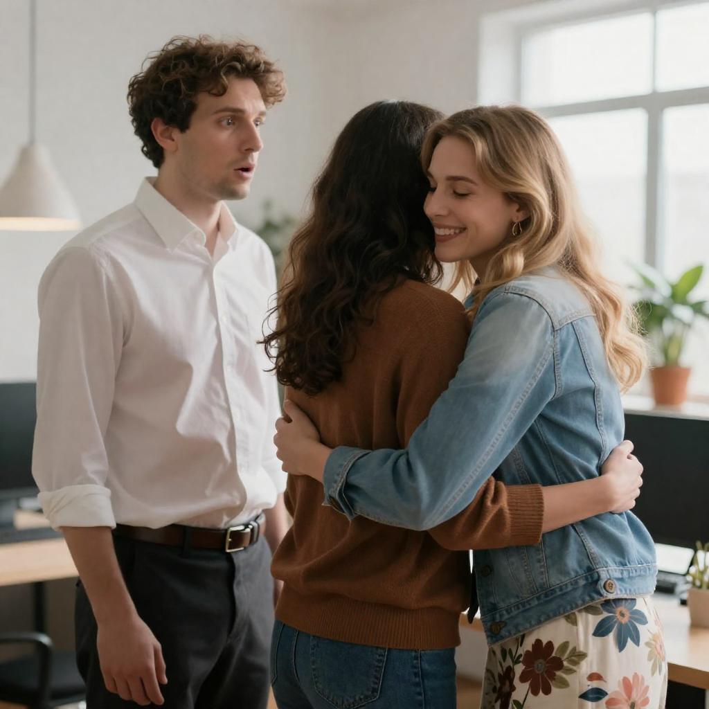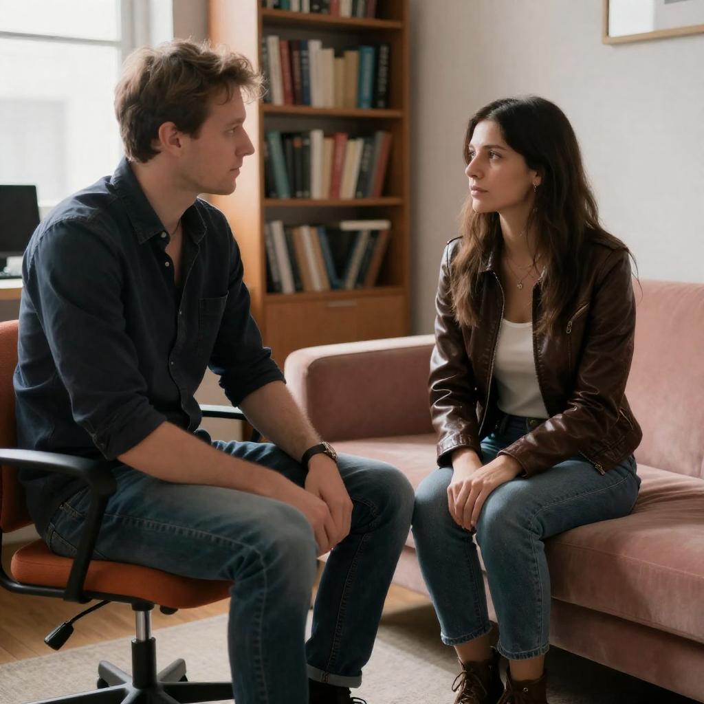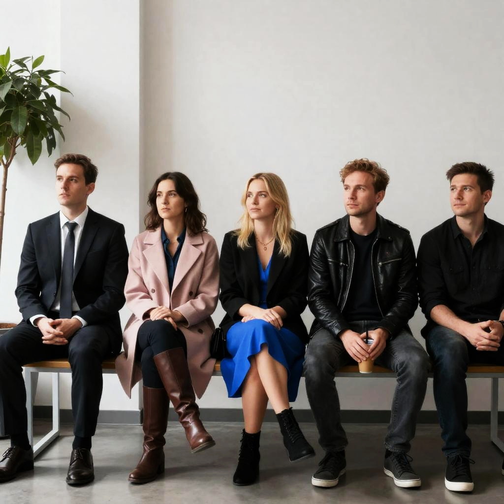 Photograph of four people sitting in a waiting area. Left: older man in black blazer, white shirt, blue jeans. Center: two blonde women, one in pink sweater, blue dress, brown boots, other in black coat, light blue dress, pink shoes. Right: man in black leather jacket, brown scarf, dark jeans. Brown chairs, white walls, metal railing in background. All seated, facing forward, relaxed. Bright indoor lighting.