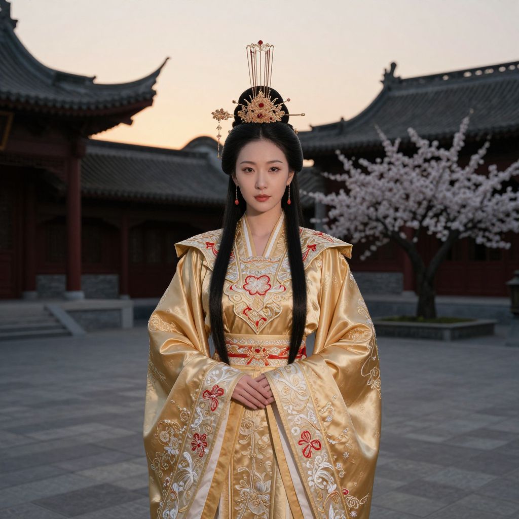 Photograph of an East Asian woman standing in a traditional Chinese courtyard at sunset. She's wearing an elaborate, golden silk traditional dress with intricate red and white embroidery, and a tall, ornate hairpiece. Her long black hair is neatly styled, and she's looking directly at the camera with a calm expression. The background features classic Chinese architecture with curved roofs and a blooming tree on the right.