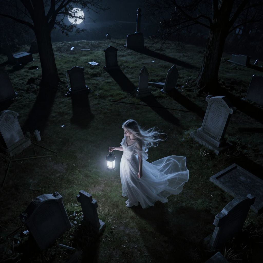 A portrait in the style of Gothic Romanticism depicts a melancholic young woman with dark hair flowing down her back, bathed in the gentle light of flickering candles. She sits contemplatively within an old cemetery, her silhouette reflected against the crumbling gravestones under a foreboding night sky. Captured from a low-angle perspective beneath her seat, this intimate scene highlights her introspective expression and delicate features, adorned with a single white flower resting on her heart—a symbol of both grief and renewal amidst the serene graveyard.