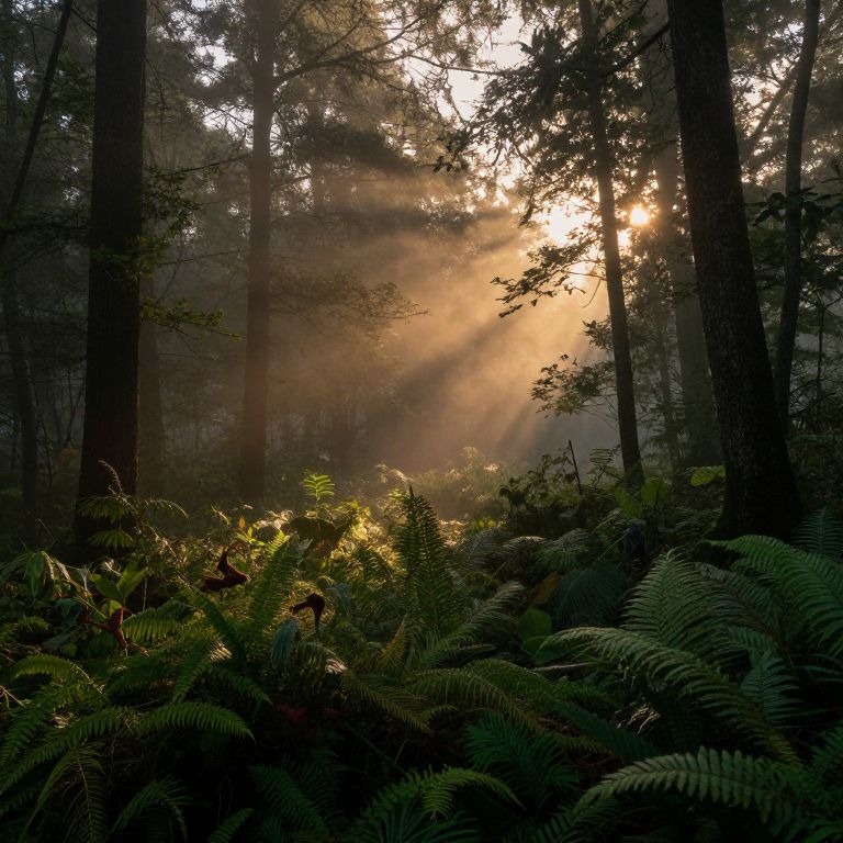 Photograph of a misty forest at sunrise. Sunlight beams penetrate through tall, dark pine trees, casting a warm, golden glow on the dense underbrush of vibrant green ferns in the foreground. The light creates a soft, ethereal atmosphere with rays illuminating the mist, highlighting the textures of the tree bark and fern leaves. The background is softly blurred, emphasizing the serene, tranquil mood of the forest. The interplay of light and shadow adds depth and contrast to the image.