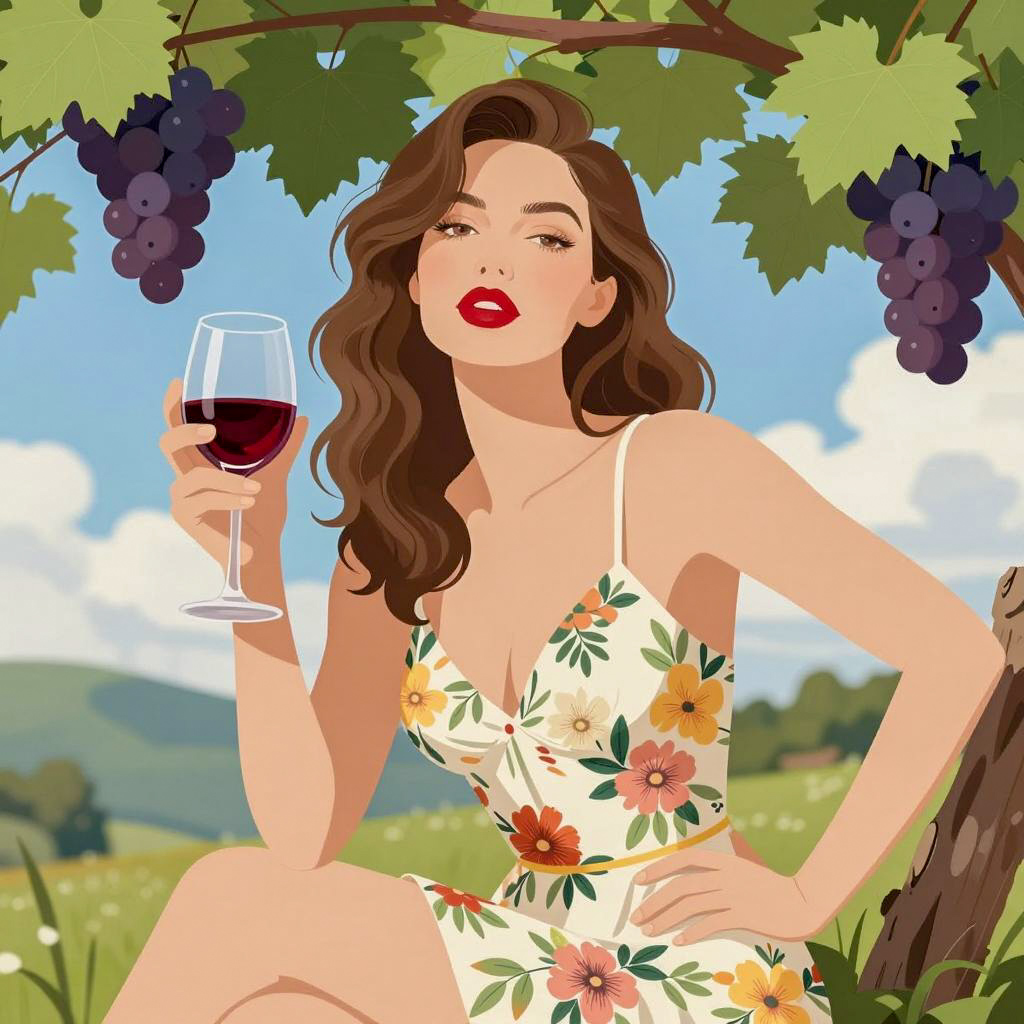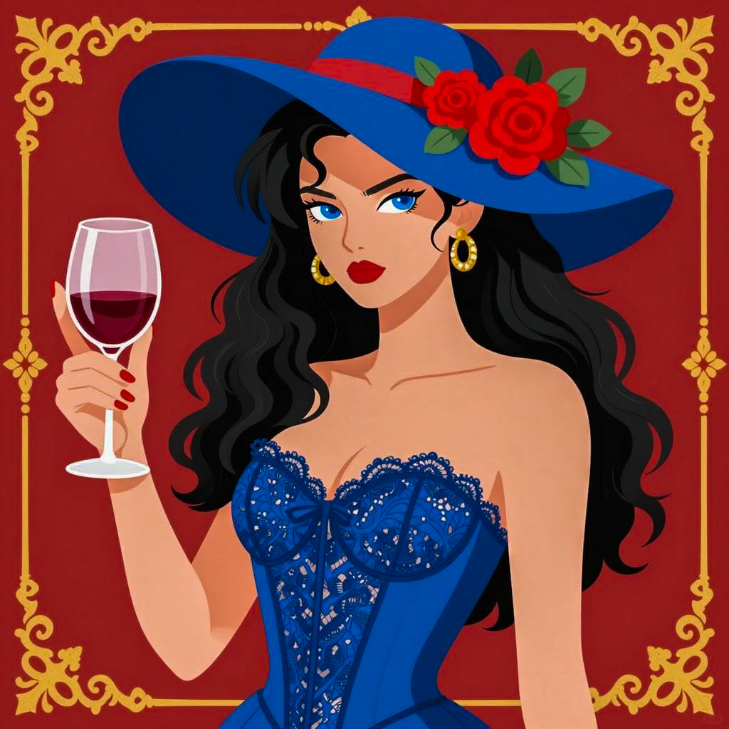Illustration of a woman with blue eyes, long black curly hair, wearing a blue lace corset and a blue wide-brimmed hat with red flowers. She holds a glass of red wine in her right hand, red lips, gold earrings. Background is red with golden patterns and more red flowers. She has a serious expression.