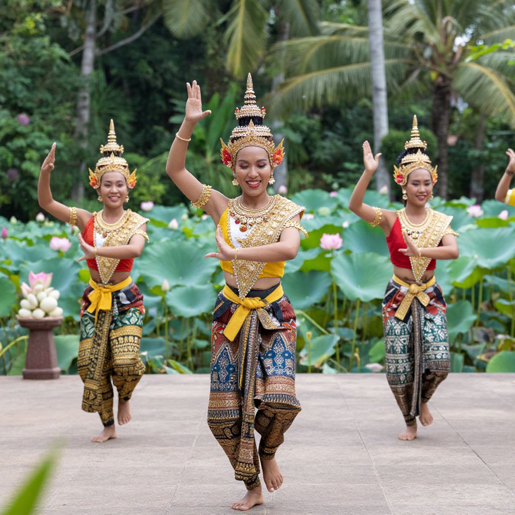 Joyful Thai dancers performing traditional dance in colorful silk costumes, detailed ornate headdresses, graceful movements captured mid-motion, lush tropical garden setting with lotus flowers and palm trees, soft natural light highlighting vibrant patterns