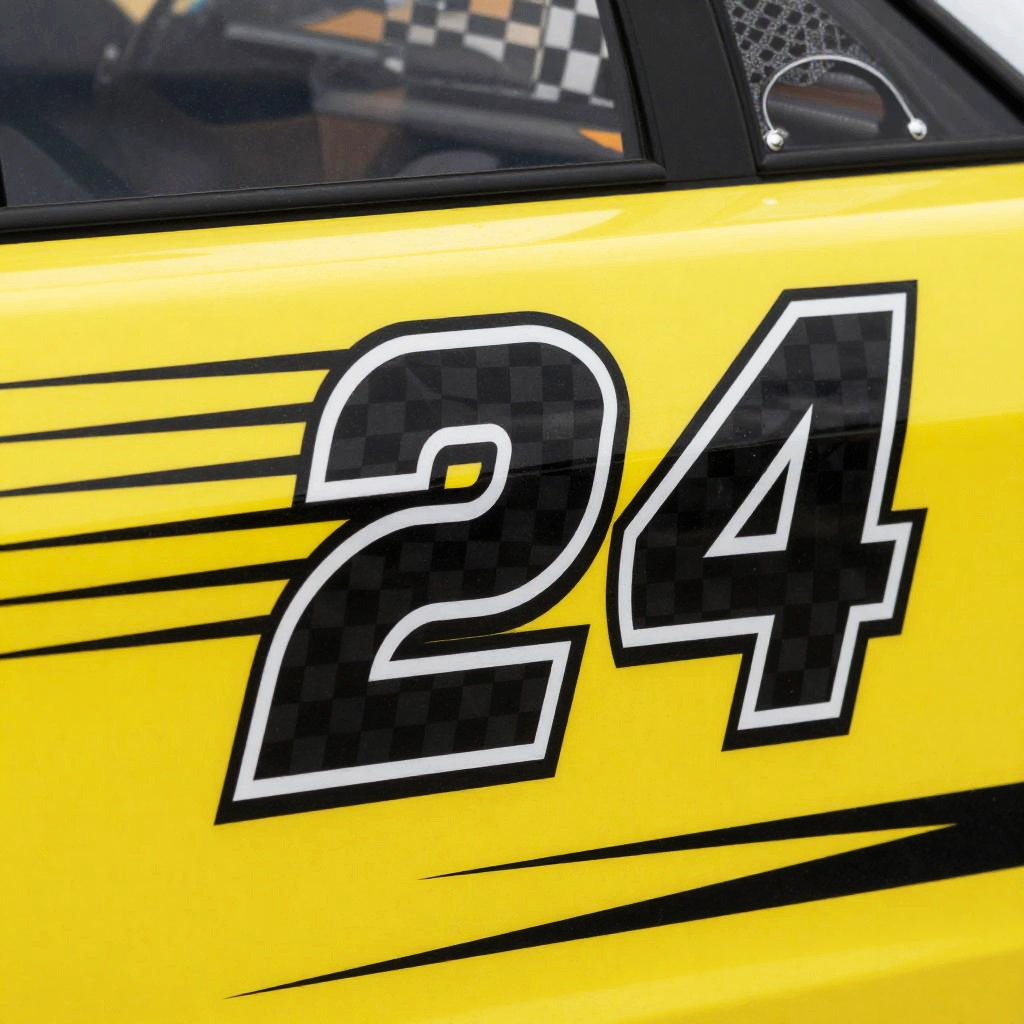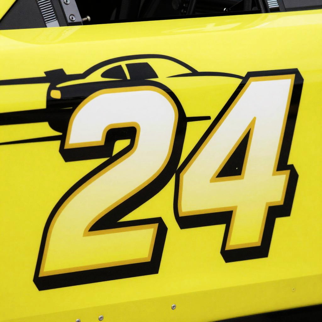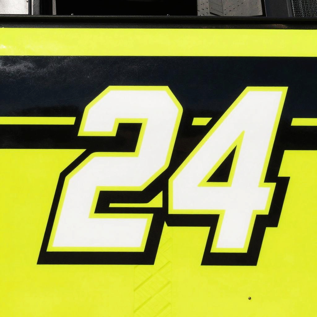 NASCAR number 24 emblem design featuring bold number overlay on racing stripes, neon yellow with black background, incorporating subtle tire tread details, modern speed-inspired font, glossy finish with vibrant highlights and shadows for depth