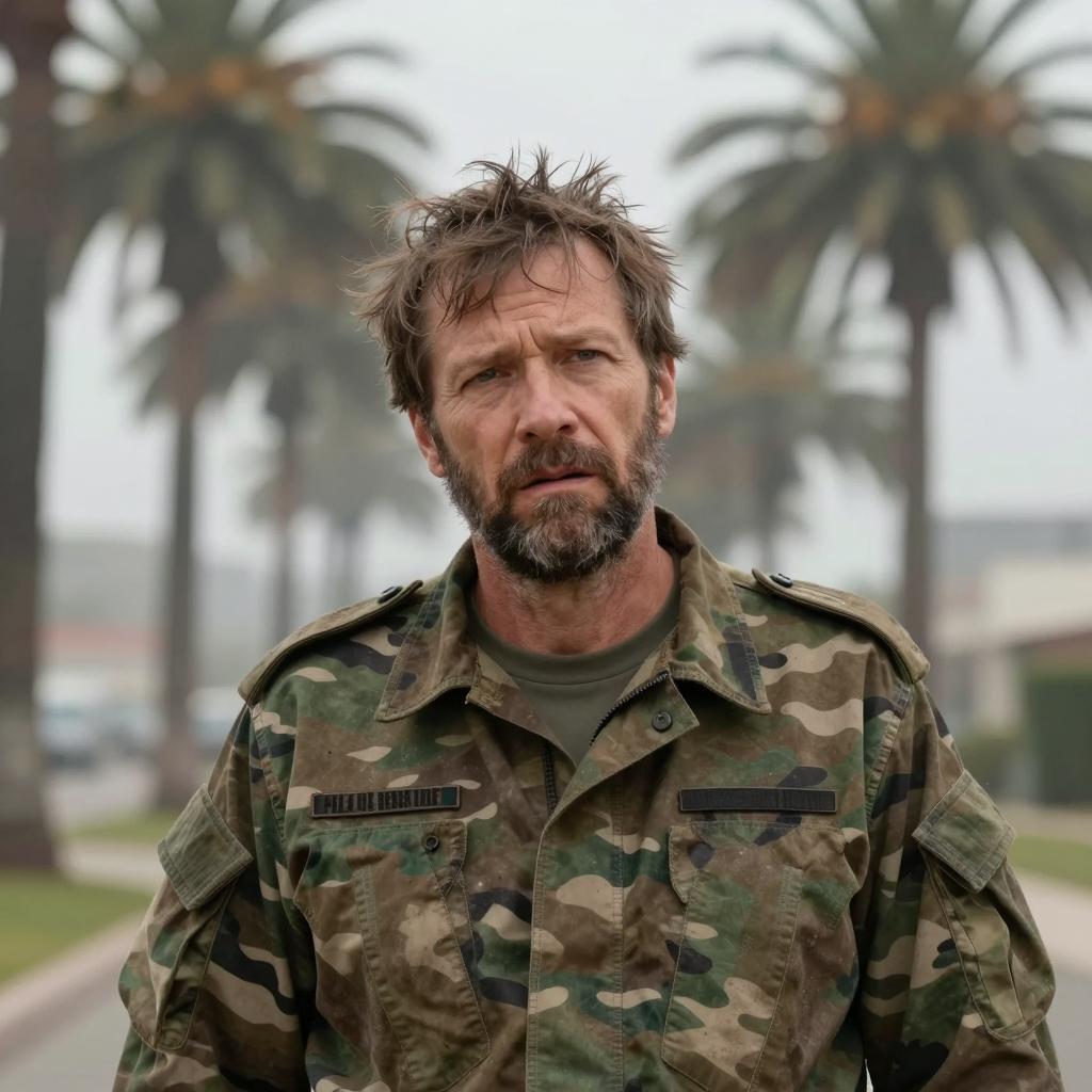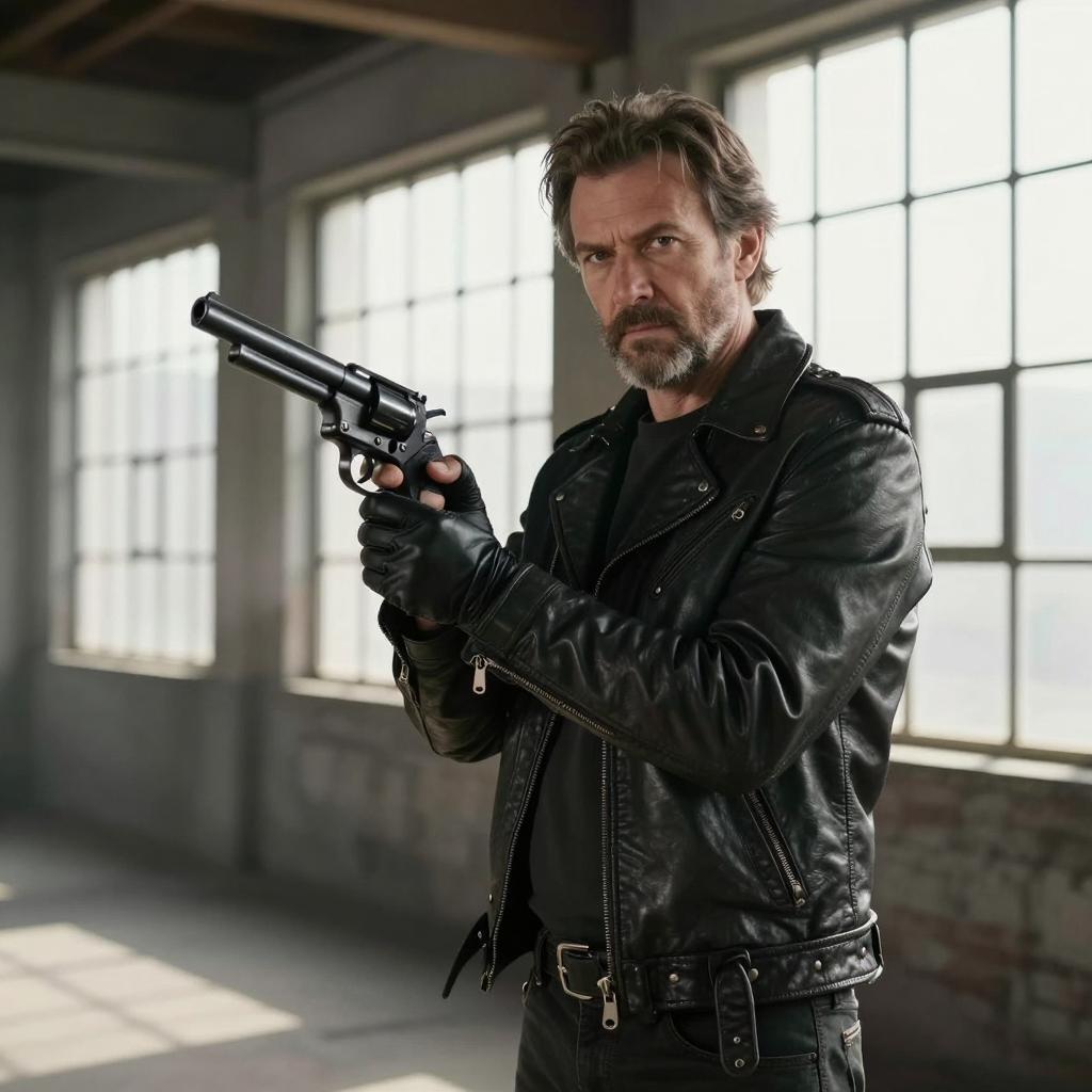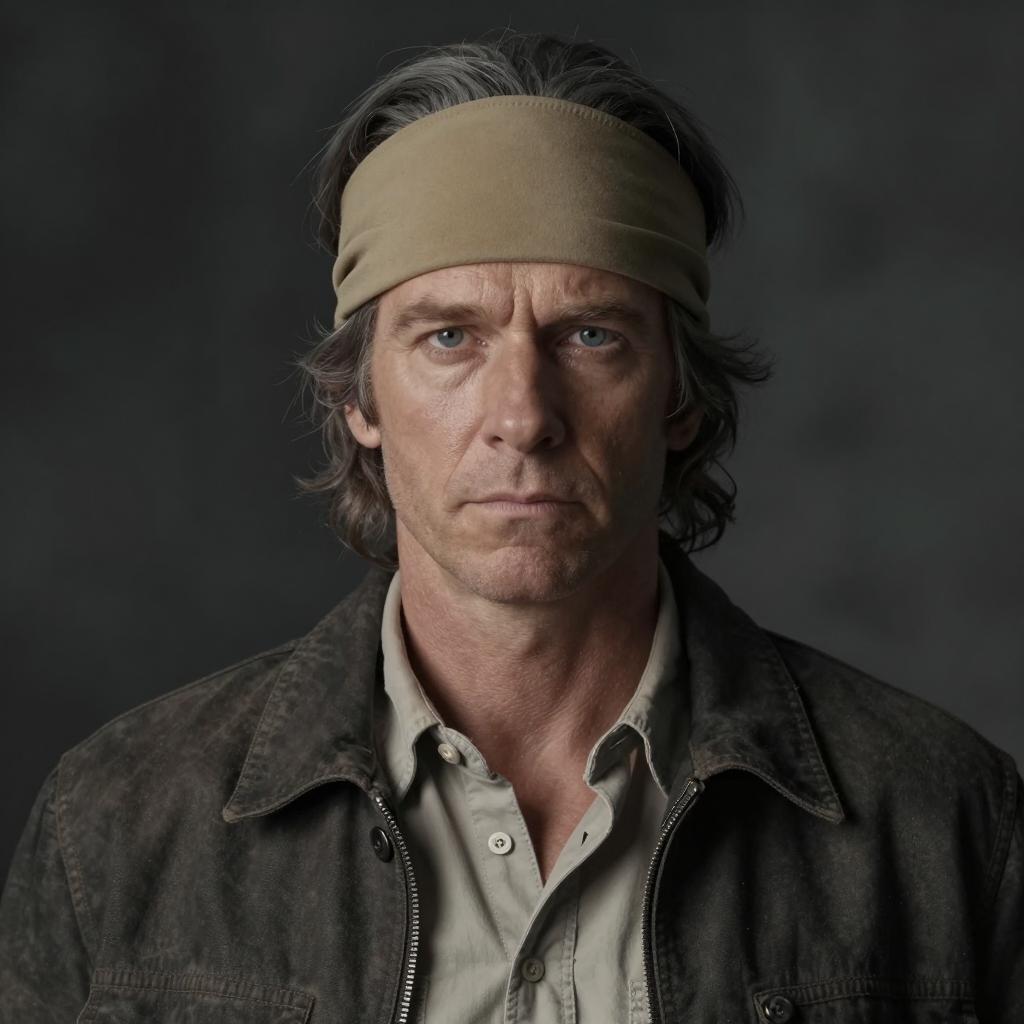 A man with medium-length dark gray hair, blue eyes, and a serious expression. He wears a tan headband and a dark, ured jacket over a light shirt. Background is dark and blurred.
