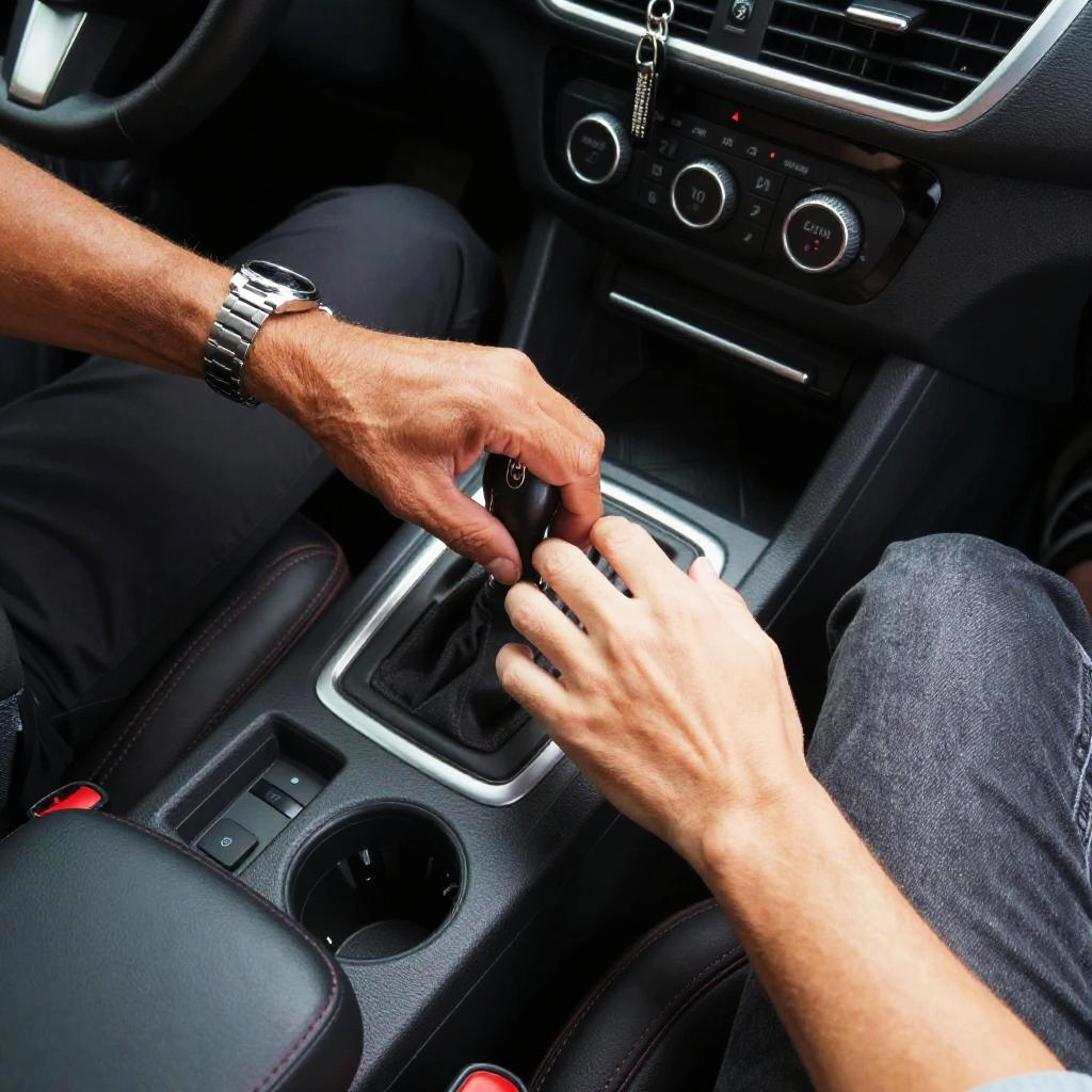 Close-up of two hands reaching for the gear shift on the center console of a car. The left hand has tan skin, is wearing a silver watch and a black shirt, while the right hand has lighter skin and is resting on the gray jeans-clad leg of the passenger. The car dashboard with climate controls and a keychain is visible in the background.