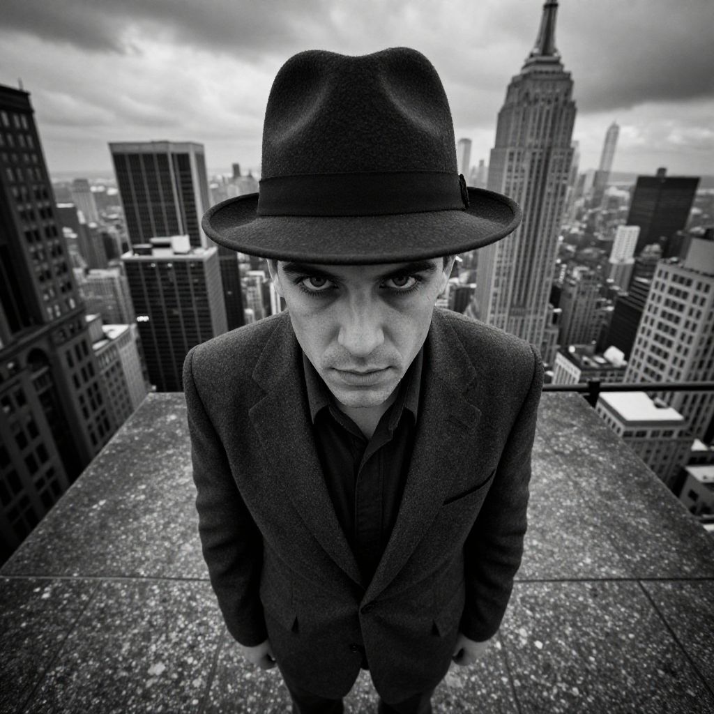 High angle shot, dramatic perspective, solitary figure, rugged suit, fedora hat, intense gaze, urban landscape, iconic skyscrapers, black and white film grain, moody lighting, atmospheric clouds, textured pavement, nostalgic feel, timeless charm. Man has masculine face and piercing eyes