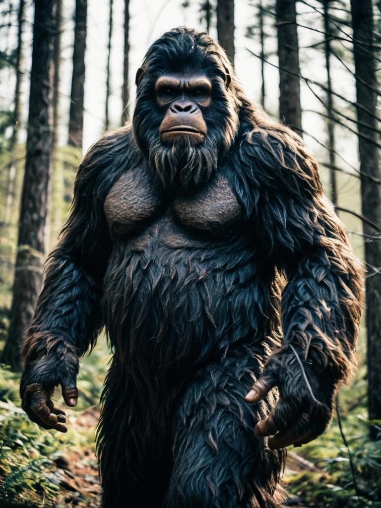 A man dressed in a highly detailed Bigfoot costume standing on a forest trail surrounded by tall trees and lush greenery, captured with cinematic realism and fantasy cosplay style.