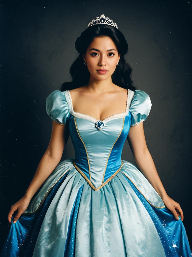 Woman in Disney Princess Dress costume, photorealistic studio portrait