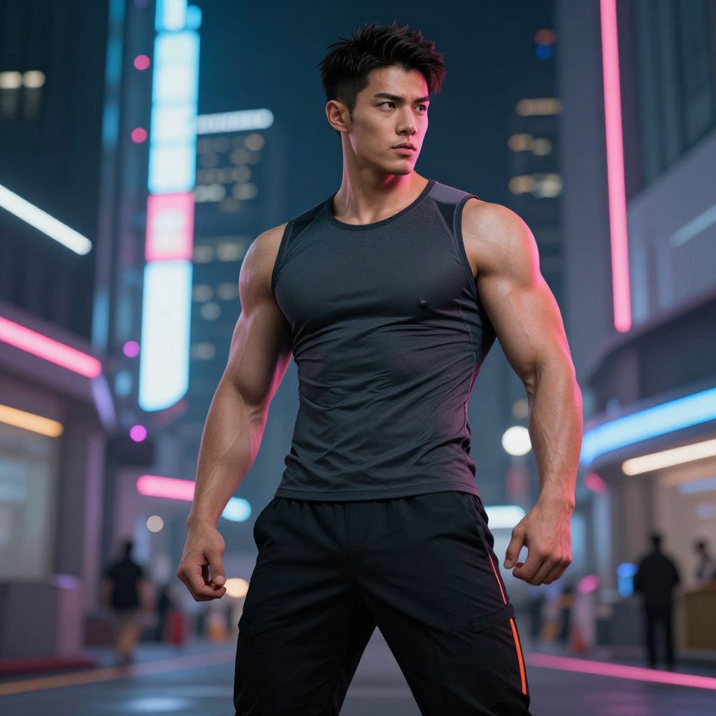 Muscular young man standing confidently in a futuristic urban setting, wearing sleek athletic gear, muscles highlighted under neon city lights, dynamic pose with slight motion blur, high detail, vibrant colors, cinematic lighting.