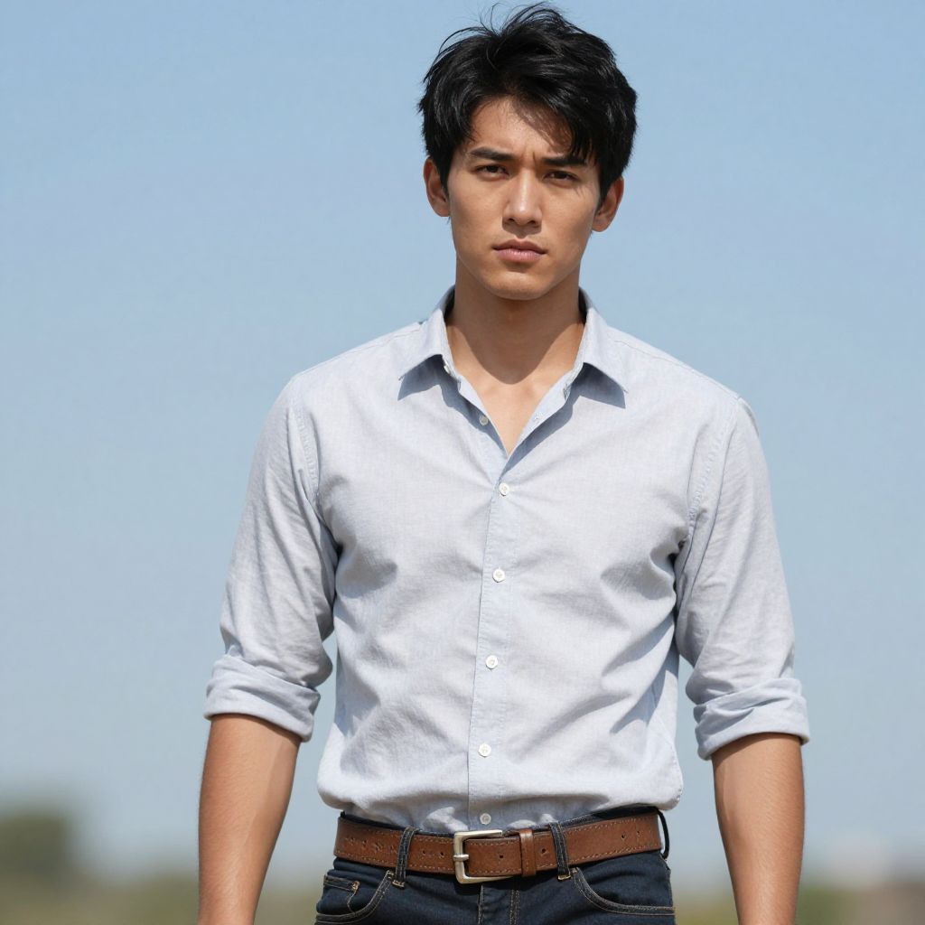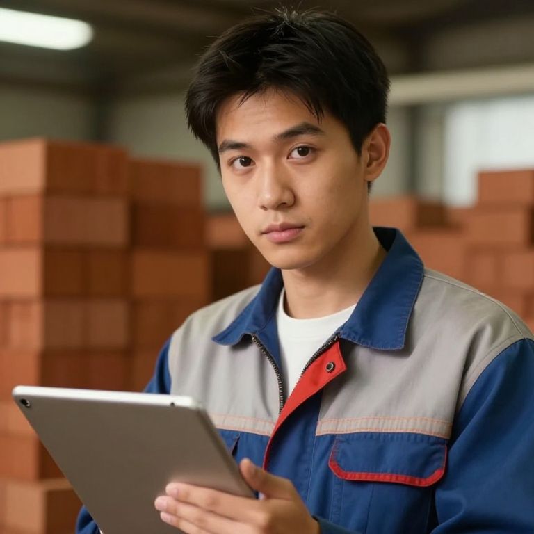 Male worker with brown hair and orange hat, wearing a brown overalls with a blue shirt and a blue vest.
