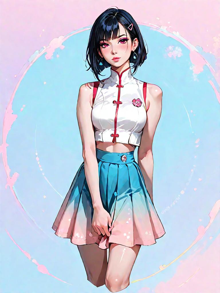 1girl, source_comics, realistic face, full body shot, Woman, glam, halterneck top in solid red, fitted waistband with decorative horizontal stripe pattern, short velvet skirt in black, flared silhouette.