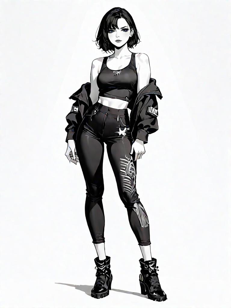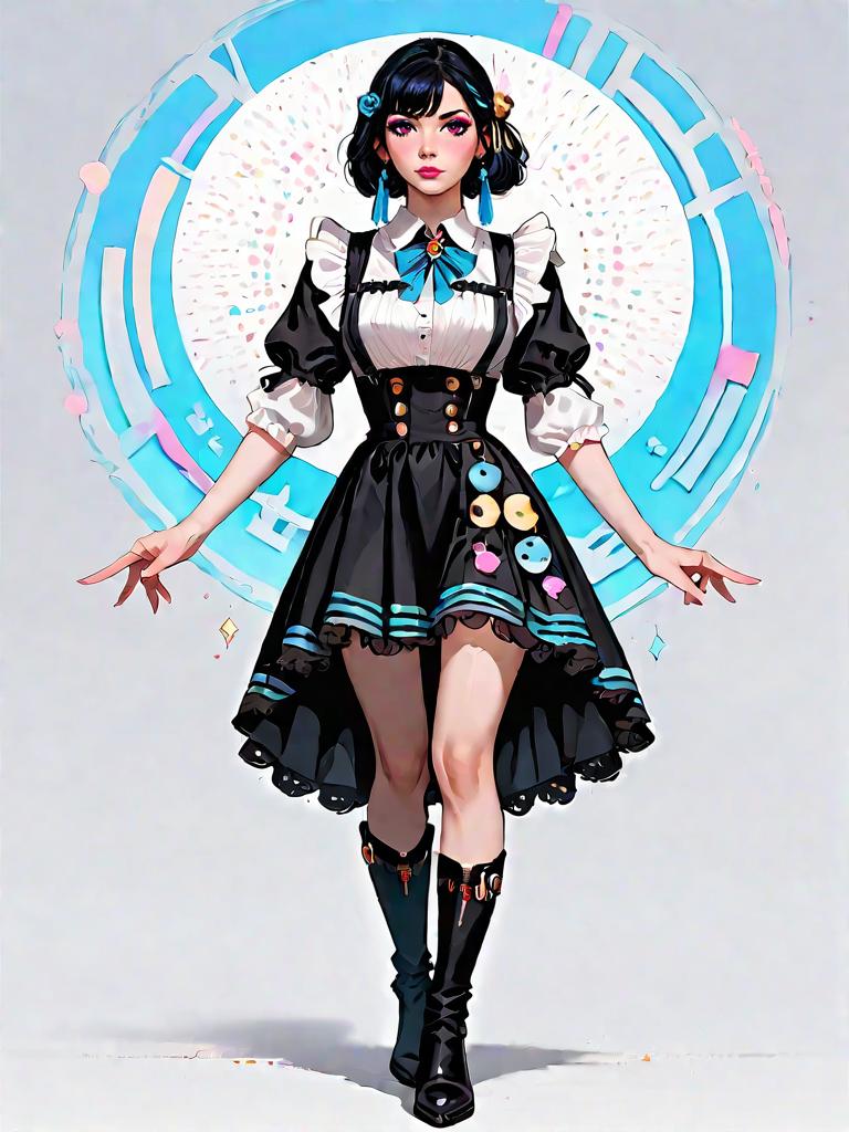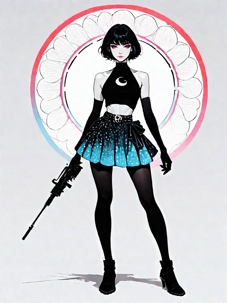 Digital illustration of a full-body anime-style woman with a realistic face. She has short black hair and is wearing a black halterneck top with a crescent moon symbol, a blue-patterned flared skirt, long gloves, and black boots. She is holding a rifle and stands confidently against a circular decorative background.