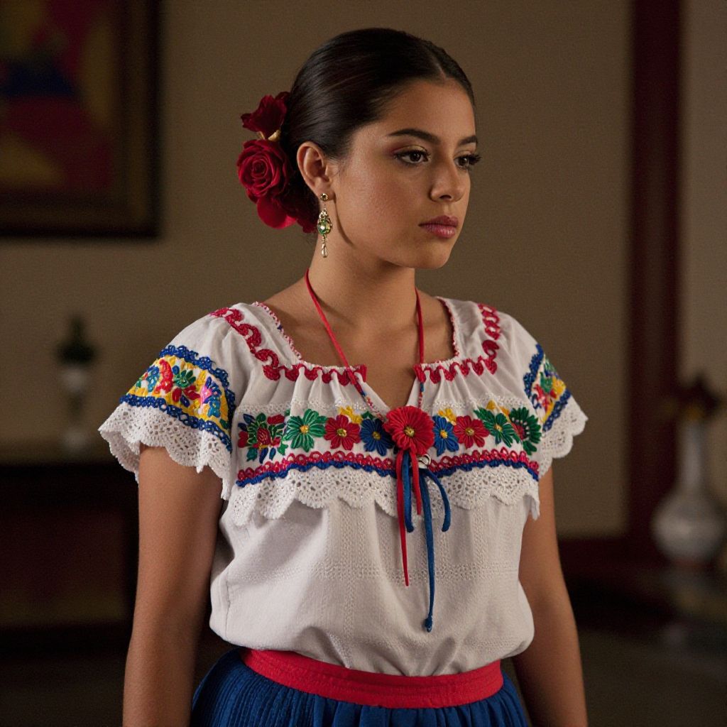 Photograph of a Latina woman with dark hair in a red rose bun, wearing a white embroidered blouse with red, blue, and green floral patterns,