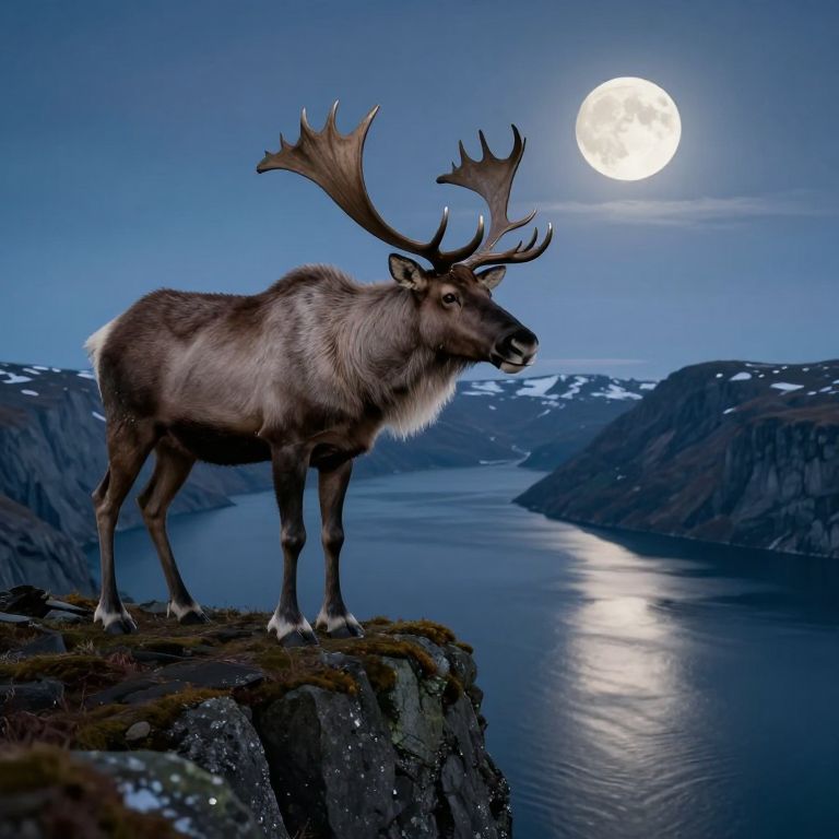 Photograph of a majestic moose with large antlers standing on a rocky cliff under a full moon, overlooking a calm, reflective lake surrounded by snow