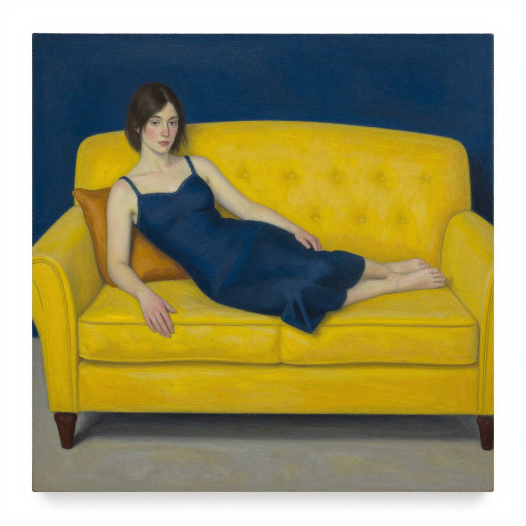 Photograph of a pale-skinned woman with short, dark brown hair reclining on a bright yellow, tufted, velvet sofa. She wears a simple, sleeveless, dark blue dress that contrasts with the vibrant sofa. Her right arm rests on the backrest, and her left arm is laid across her lap. She is barefoot, and her legs are stretched out along the sofa. An orange pillow is placed behind her back. The background is a solid dark blue, making the yellow sofa and her dress stand out prominently. The overall composition is minimalistic and stylish.