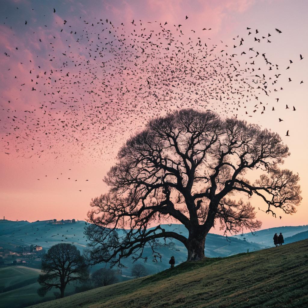 Throwback in the style of Van Gogh, nostalgic interpretation of Italian countryside, medieval peasants tormented by dark omen in the sky, late winter dawn with soft light, murmuration of starlings, ancient oak trees