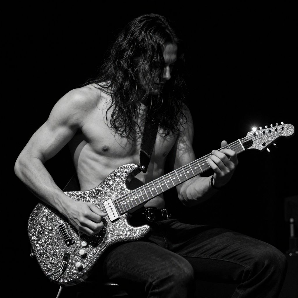 Photograph of a shirtless, muscular man with long, wet hair playing a glittery electric guitar against a black background. Intense, high-
