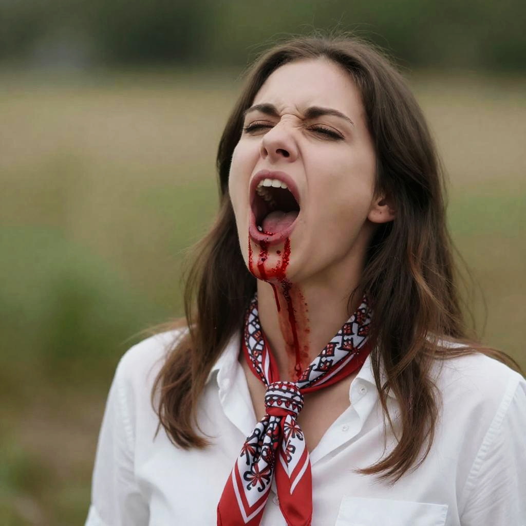 Three women with dirty, long hair and smeared faces eat raw, bloody meat outdoors. One woman on the left smiles, holding meat in her hands. Central woman bites into meat, eyes closed. Woman on the right faces away, holding meat. Grass, dirt, and a tree in the background.