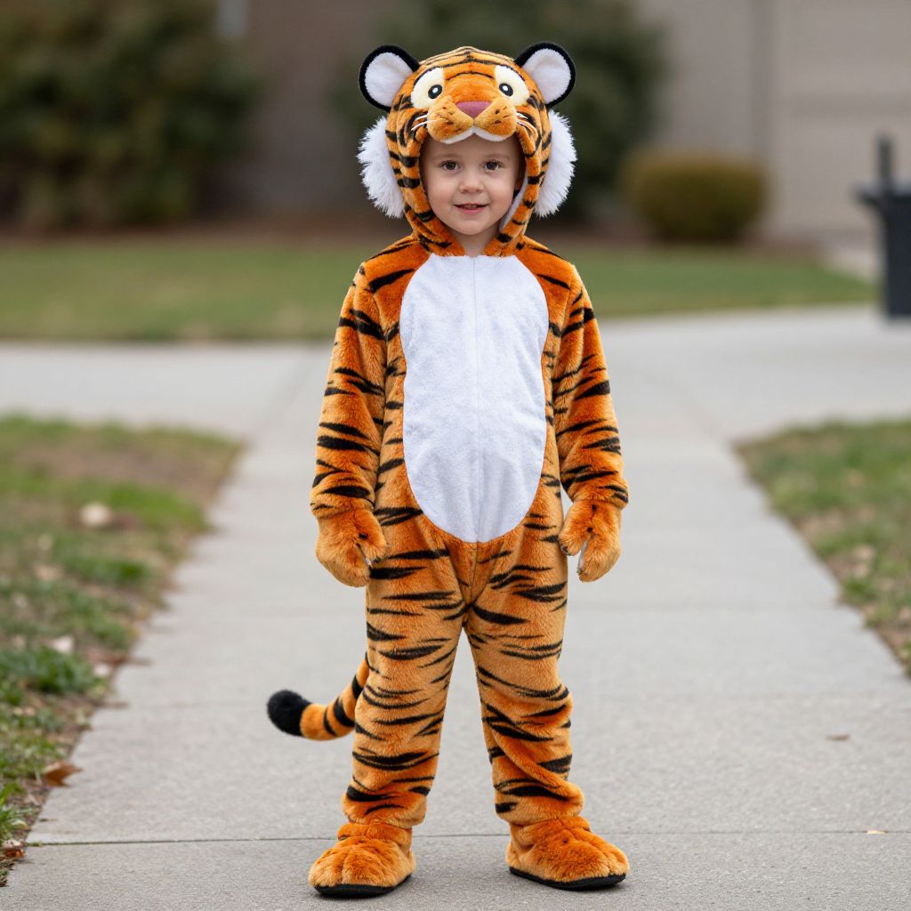Terrific Tiger Kid Costume, child in a tiger costume standing on a sidewalk