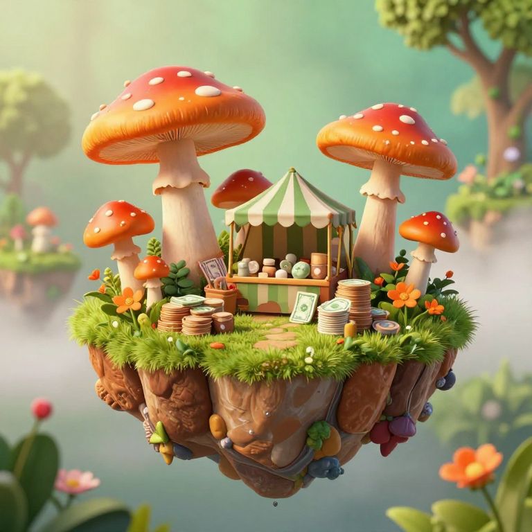 A whimsical 3D-rendered scene depicts a serene, floating island adorned with vibrant orange agaric mushrooms and delicate orange flowers, evoking a magical marketplace where nature's bounty replaces currency, set against a dreamy, impressionistic backdrop of soft lighting and misty greenery.