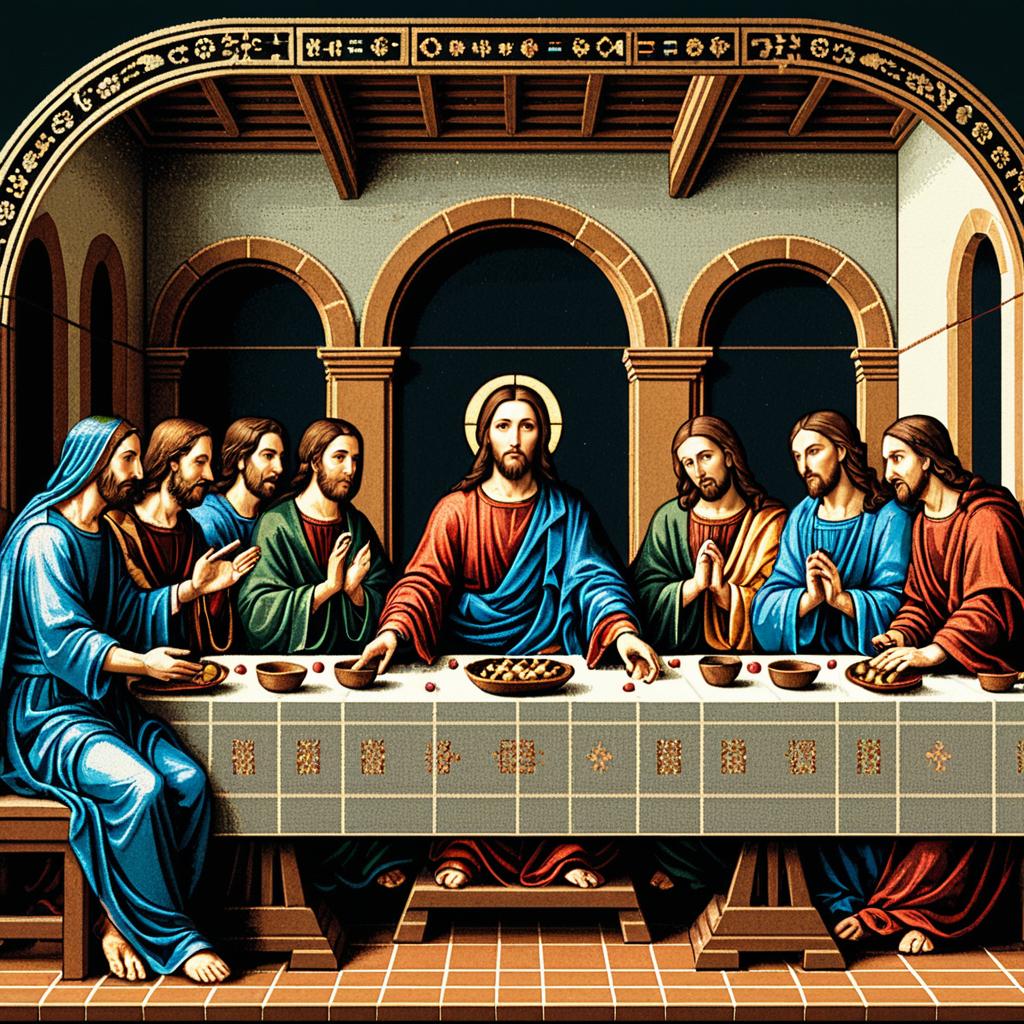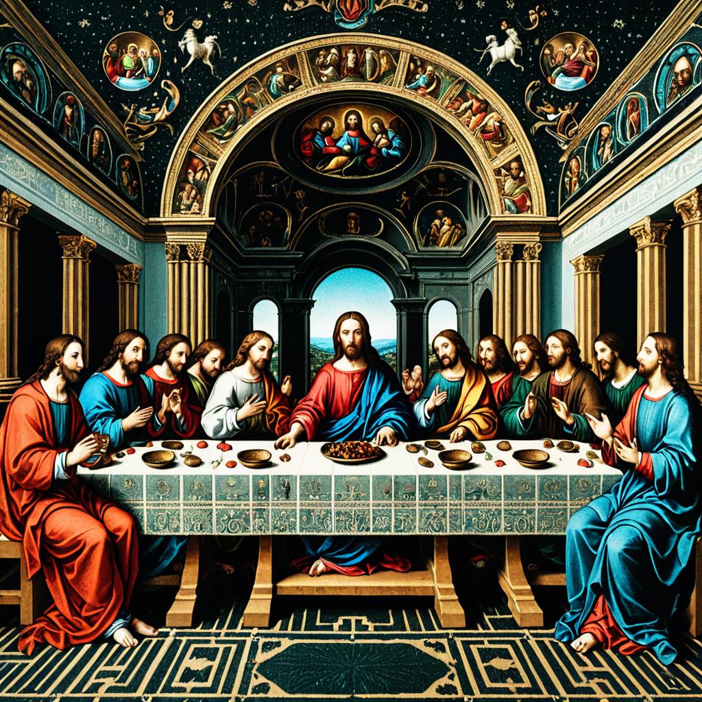 Stylized depiction of The Last Supper in an Art Deco style combined with intricate PCB and motherboard design elements. The image features Jesus and his disciples seated at a table with geometric patterns, metallic gold and green hues, and a futuristic technological aesthetic.