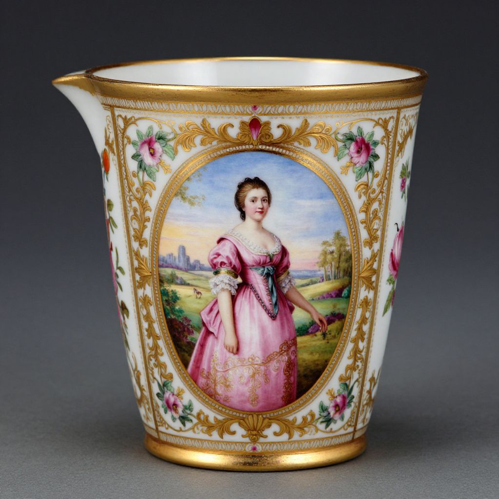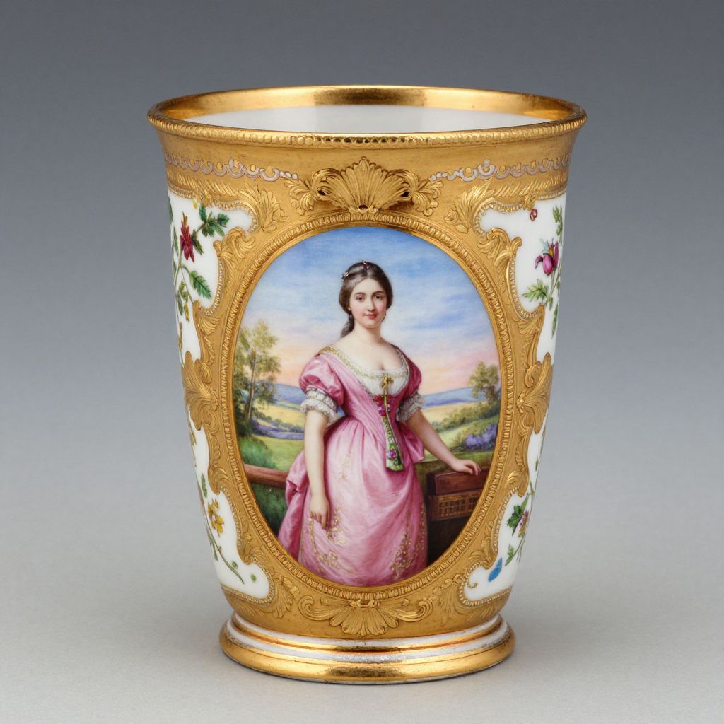 Decorative porcelain cup with a gold rim and floral patterns, featuring an oval portrait of a woman in a pink dress against a landscape background.