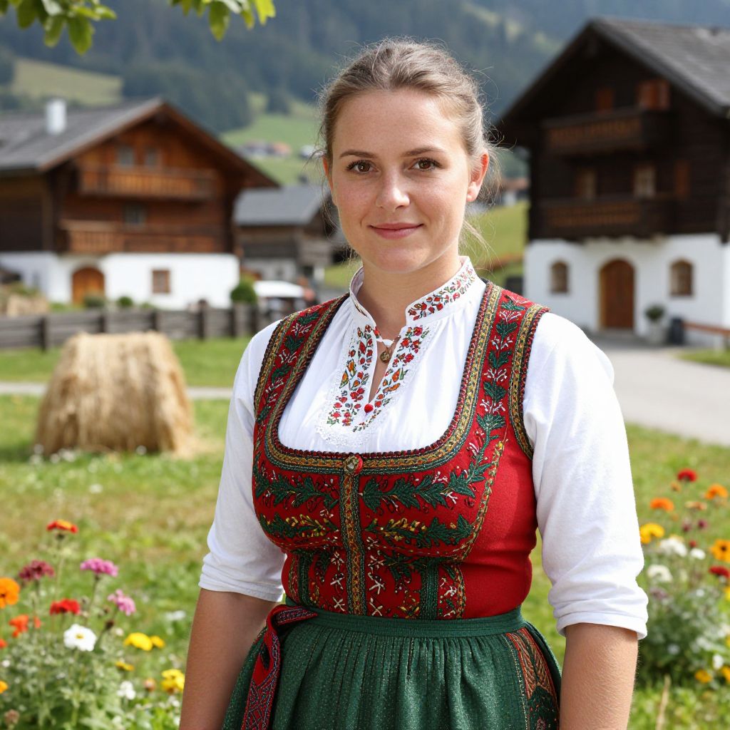 A realistic photograph of a Swiss folk woman in her late 30s with warm brown eyes, fair skin, and a gentle smile, wearing a traditional embroidered vest and skirt in rich red and green hues, standing in a sunlit alpine village square with wooden cottages in the background, hay bales, and blooming alpine flowers around her, authentic folk atmosphere with soft natural light. The woman has big tits and cute face