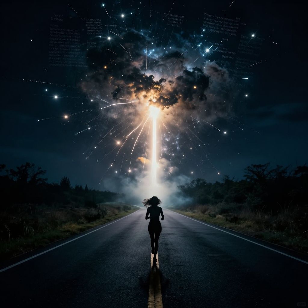 (( It was me on that roadBut you couldn't see meToo many lights out, but nowhere near hereIt was me on that roadStill you couldn't see meAnd then flash lights and explosionsIt's about you and the sunA morning runThe story of my makerWhat I have and what I ache forI've got a golden earI cut and I spearBut what else is there?Road's end getting nearerWe cover distance still not togetherIf I am the storm, if I am the wonderWill I have flashlights, nightmaresAnd sudden explosions?There's no room where I can go andYou've got secrets, too...Will I have flashlights, nightmaresAnd sudden explosions?I don't know what more to ask forI was given just one wish))Dark but Magical nightmare dreamscape style photograph, Dramatic Getty Images quality, frustration and desperate irritation with a cathartic release. :(breathtaking, detailed, expansive, photorealistic ultra high definition, highest quality, ultrarealistic!), night-time, perfect composition, dramatic action, sharp focus, photo, intricate details, highly detailed, experimental angles, experimental lighting, motion, dramatic, empathy invoking, Zeiss Master Prime Lenses, Panavision, Film Stock Footage, with a Nikon Z 14-30mm f/4 lens at 30mm. 10 seconds, f/5.6, ISO 6400, Cinematic photograp, magnificent, ethereal, epic, awe inspiring, motion blur
