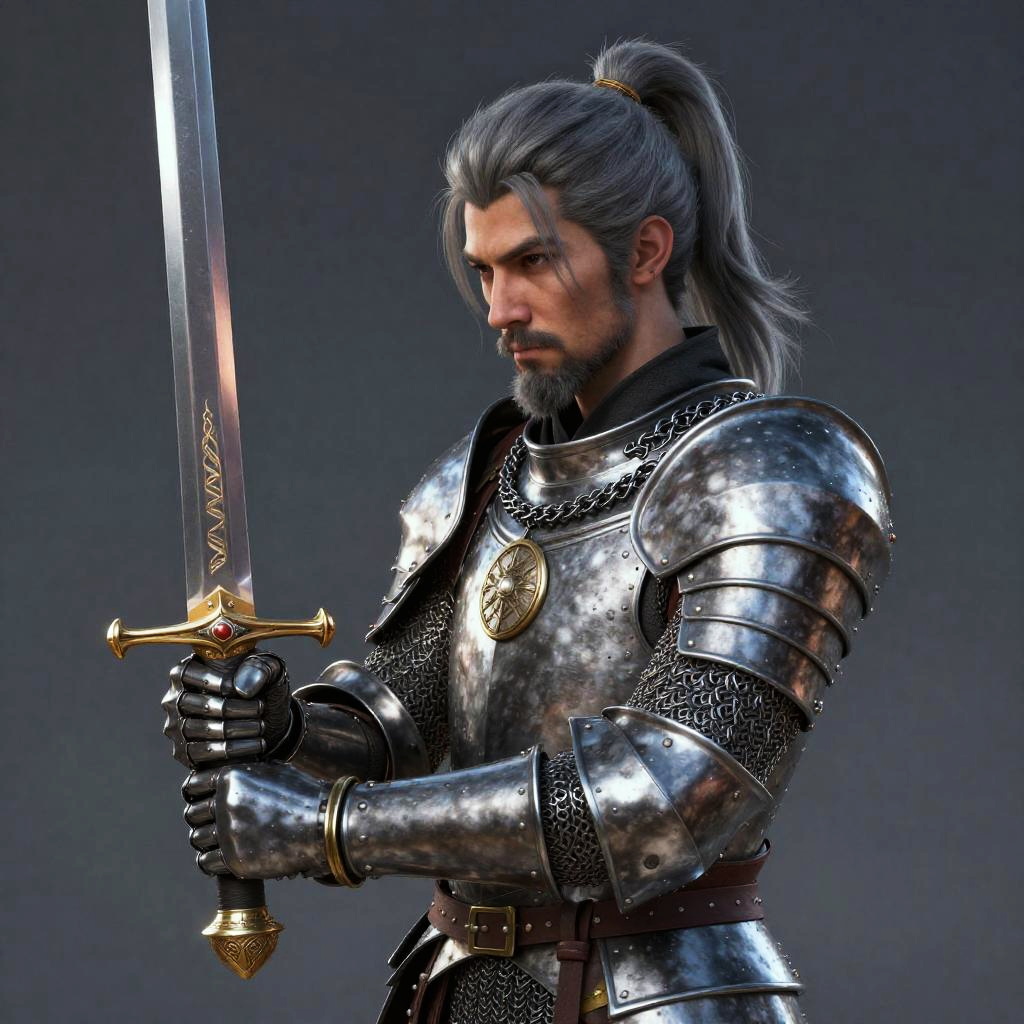 A photograph of a muscular, white-haired man with a full beard standing in a plain room with wooden floors and a beige wall. He wears black leather armor with silver pauldrons and gauntlets, a brown leather belt, black pants, and boots. His right hand grips a long, silver sword with a crossguard, while his left hand rests at his side. His intense gaze is directed forward. The lighting is soft, highlighting the metallic sheen of his armor. The overall style is medieval fantasy, with a focus on warrior attire and weaponry.