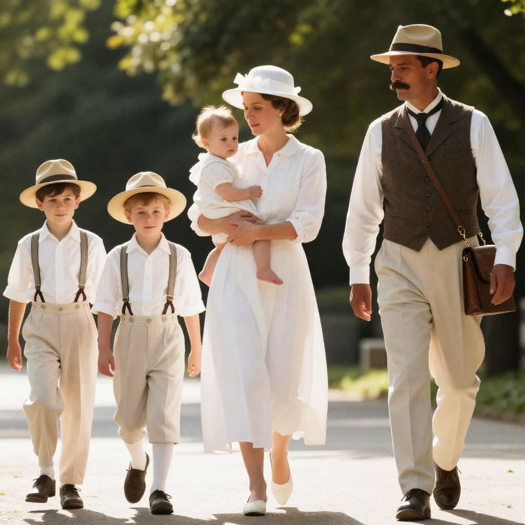 Photograph of a family walking outdoors. Five people in white 1920s attire with hats. Father with mustache, satchel, and brown vest on the right. Mother with white blouse and hat holding baby in the center. Two boys on the left with suspenders and hats. Green trees in the background. Bright sunlight.