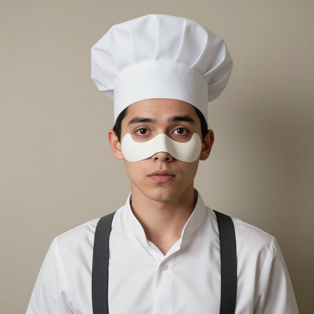 Photograph of a young man with light brown skin and short black hair, wearing a traditional white chef's hat and a white mask covering his eyes, giving a mysterious appearance. He has a neutral expression, dressed in a crisp white chef's uniform with black suspenders. The background is a plain, light gray wall, making him the focal point. The image has a clean, studio-style lighting, emphasizing the contrast between the white clothing and mask against the neutral background.