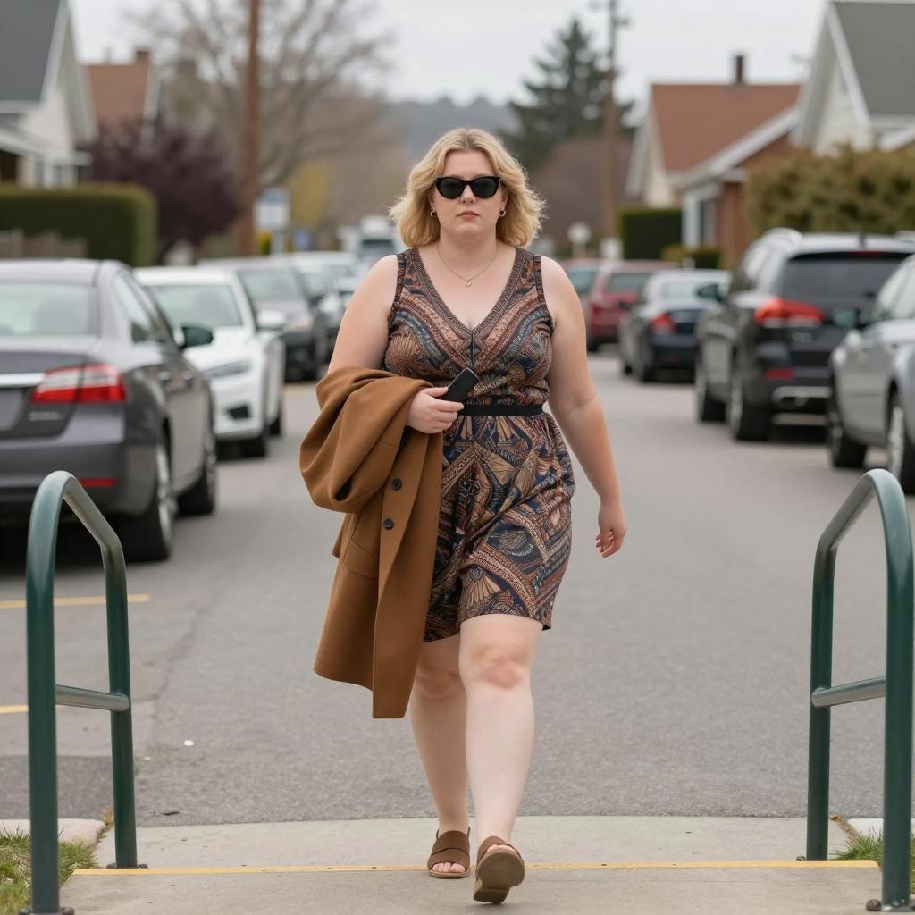 Confident Plus-Size Woman in Red Dress Surrounded by Photographers