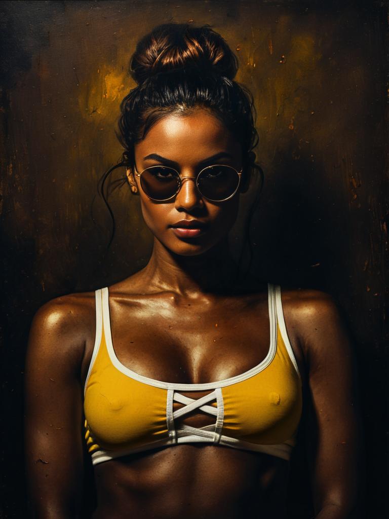 Woman, sporty chic, two-piece swimwear in soft pastel blue, scoop neck bikini top with cut-out detail, matching mid-rise bikini bottoms, cat-eye sunglasses with reflective lenses, updo hairstyle with loose strands, solid color backdrop. --sref 1405