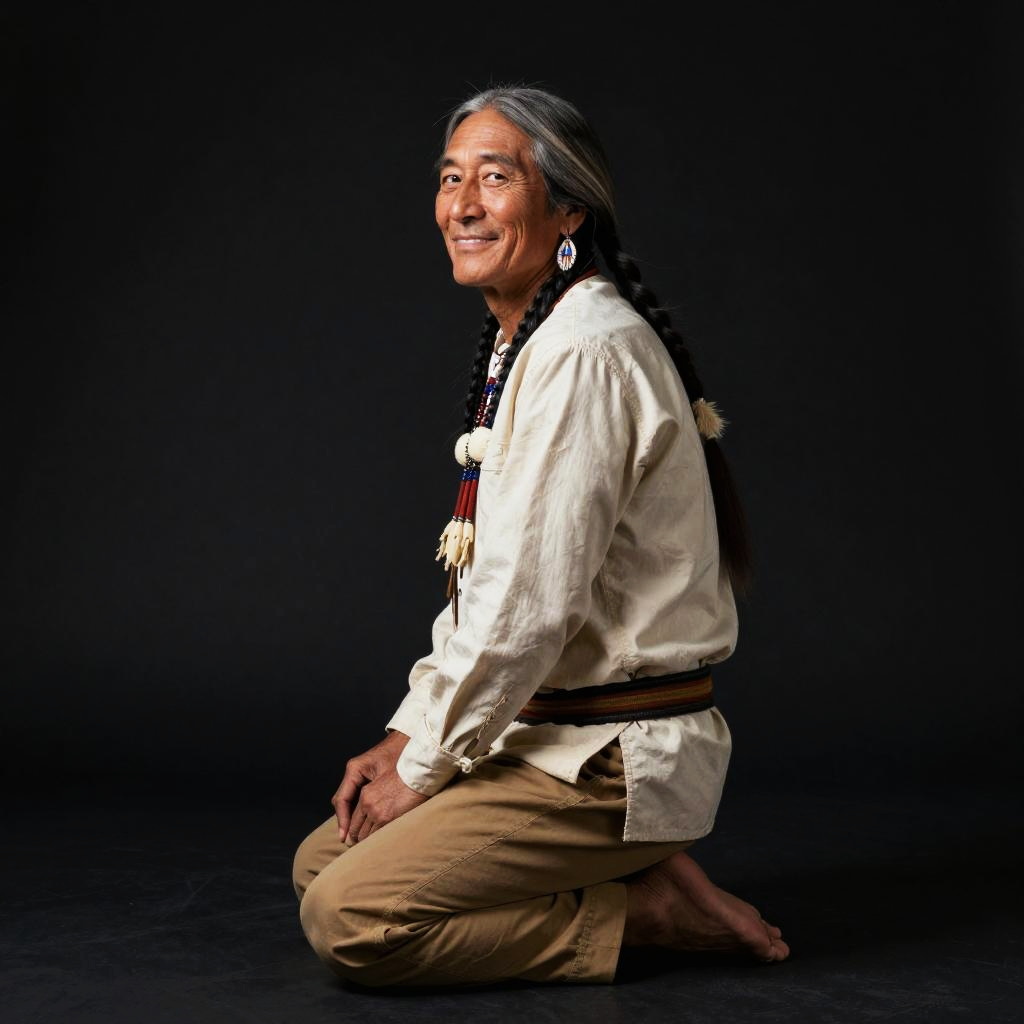 Portrait of a 47-year-old Native American man, kneeling and looking back with a smile, in the style of Georgia O'Keeffe, Anish Kapoor, dark artistic strokes, pure black background, photorealistic studio lighting, high resolution