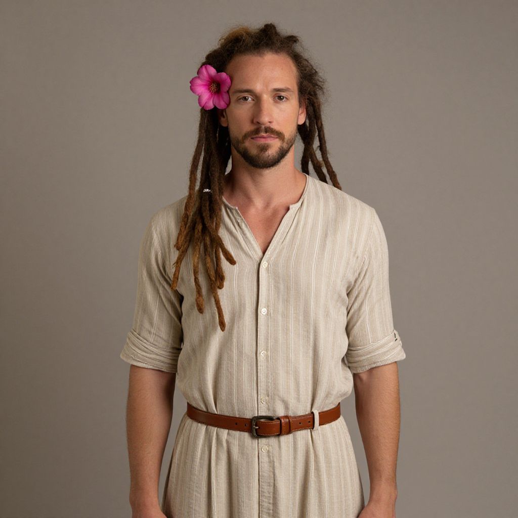 Man with dreadlocks and a pink flower in his hair. He is wearing a beige striped dress with a brown belt.