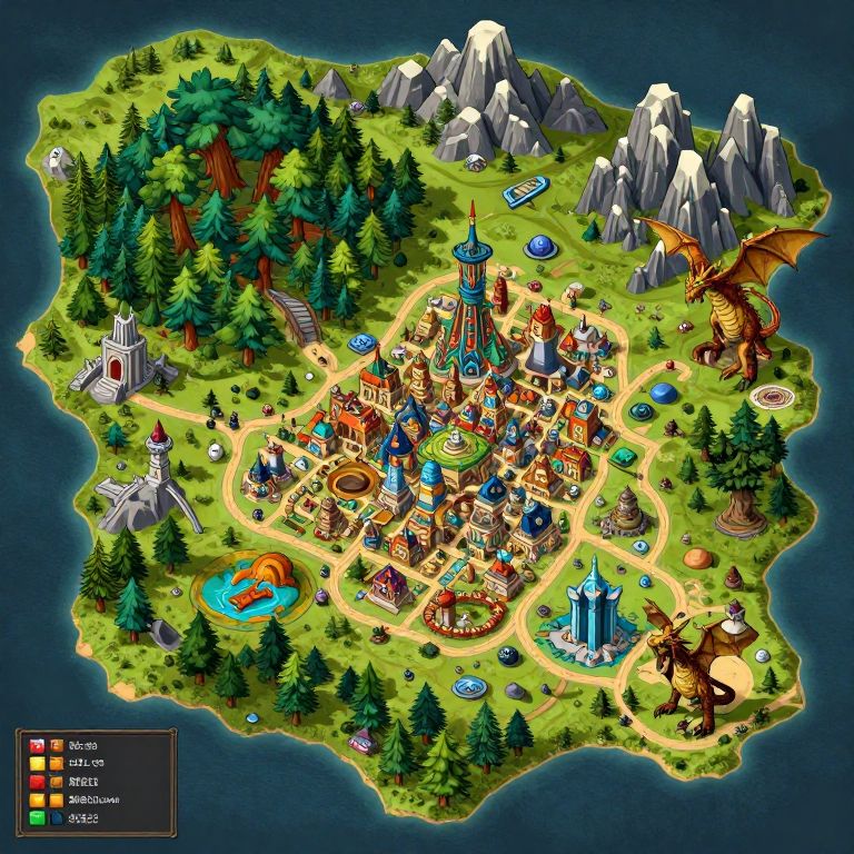 Colorful isometric digital map of a fantasy village featuring a central tower, dragon, forests, mountains, and various buildings with vibrant details.
