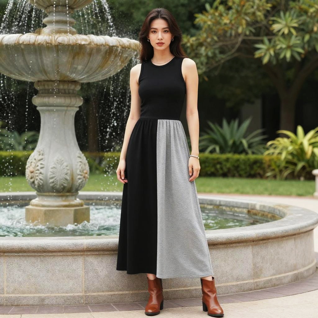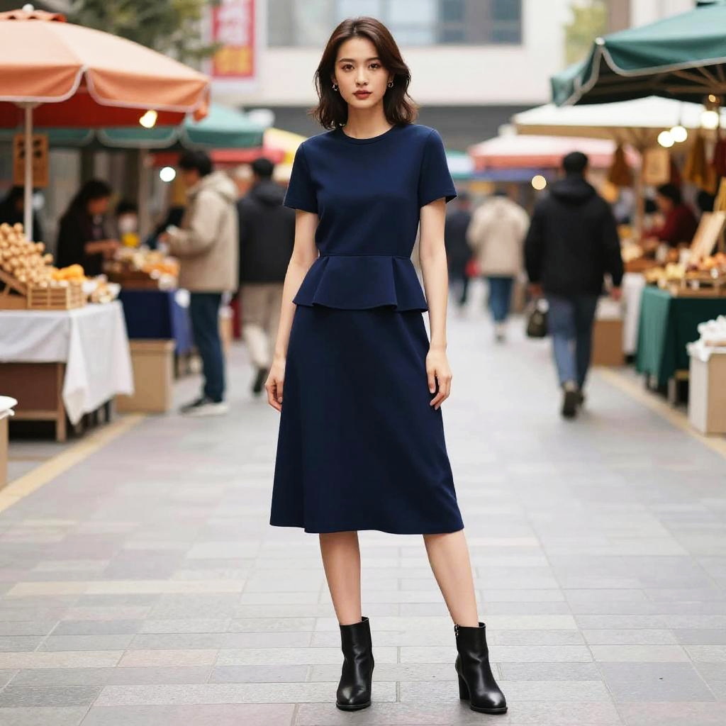 A woman, in a modern minimalist style, wearing a solid navy blue A-line dress with a high round neckline and oversized peplum waist, paired with black ankle boots, standing in a vibrant market square, surrounded by colorful stalls and lively activity, natural makeup and casual hairstyle, visual style inspired by JC Staff. Sexy. Pretty face and beutiful eyes